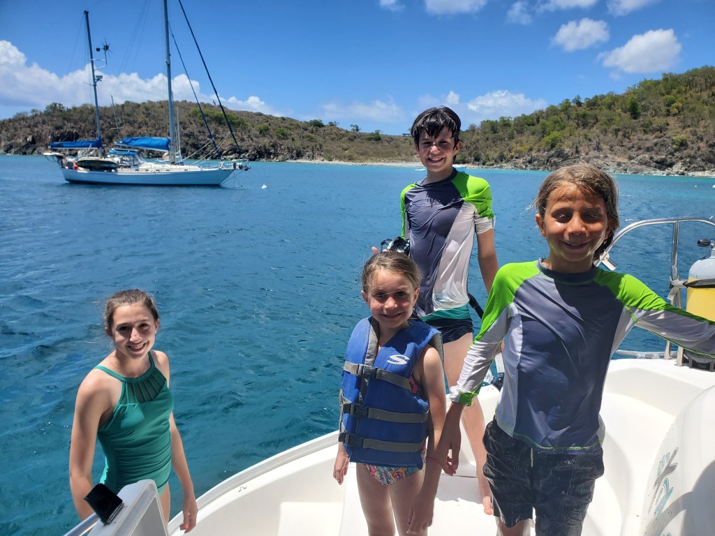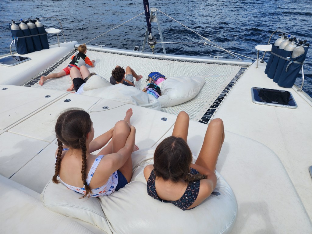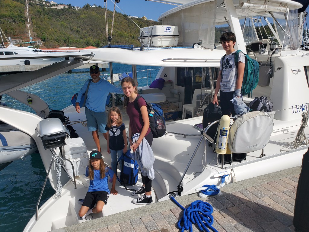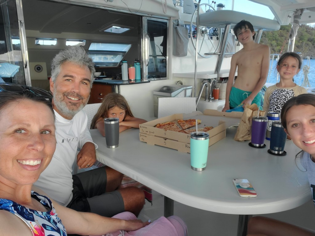 They finished their charters and we closed on the boat on June 1st. Cale came down to be at closing. I brought the kids down as soon as they were done with school on the 4th. We spent days going through every storage space minimizing and adjusting to make it work for a family of 6 instead of vacationers for a week. It was a daunting job. It was so well stocked, we started joking that if we wished for something the boat would provide it for us. Again and again, we thought we need this or that and within an hour it would show up. We had to downsize a lot of their fancy dishes and plates so make room for mac and cheese and cereal. It’s been a never ending job, but so worth it and we are grateful for the boat that we found.