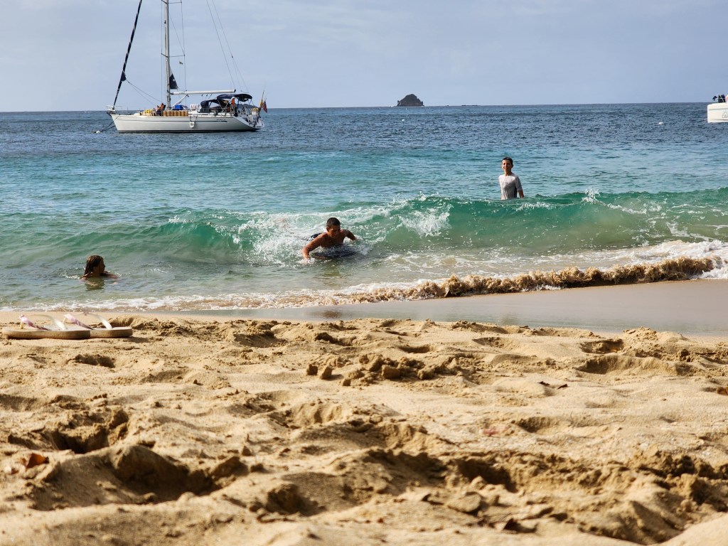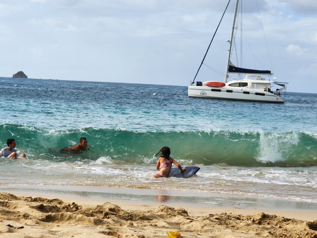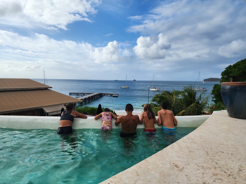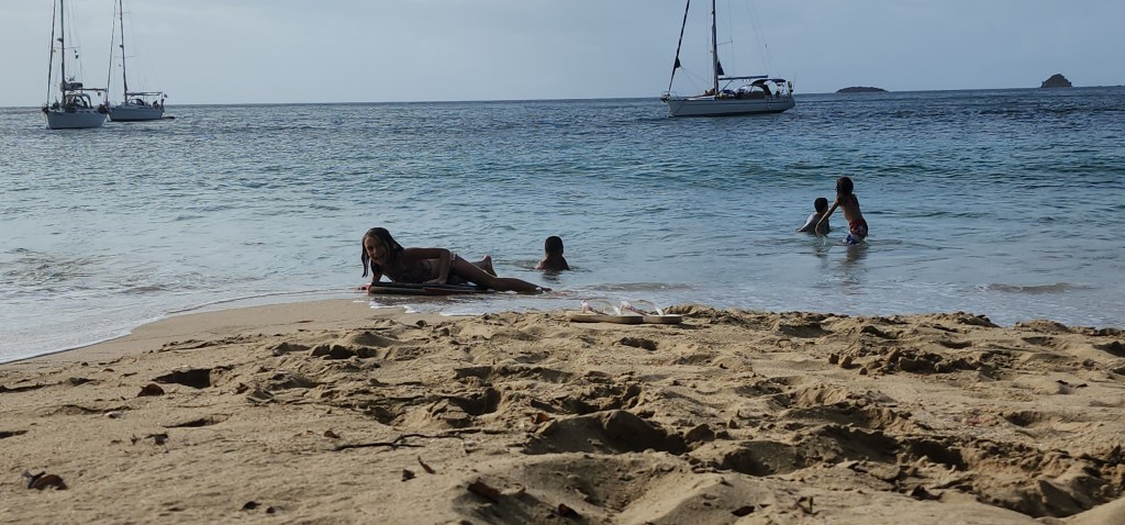 We went ashore to a beautiful restaurant and resort called Mayreau Beach Club. They said we could use their dinghy dock, pool and even showers! We went to shore and relaxed on the beautiful beach. The kids played on the boogie board and tried to catch waves. A highlight was seeing Kelsey get pummeled by several waves but popping up with a head full of sand and a huge smile on her face.