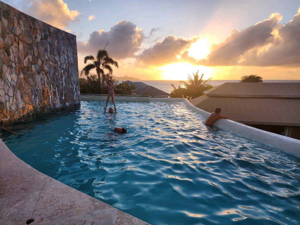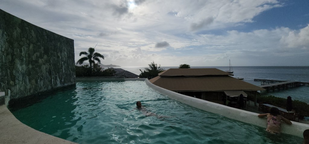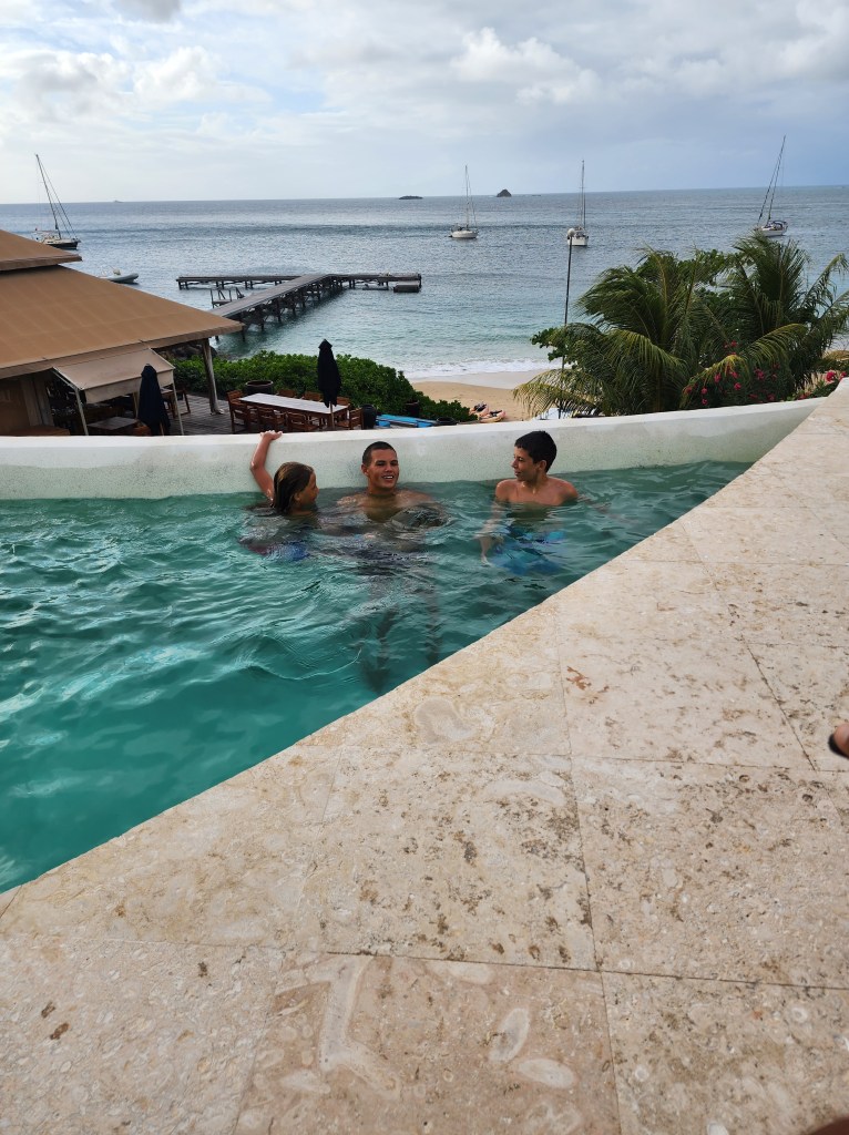 The kids swam in the amazing pool with ocean overlooks before, during, and after a torrential down pour of rain. The adults took shelter. We came back to the boat for dinner and then watched True Spirit. Made our currently “rolly” anchorage seem calm.