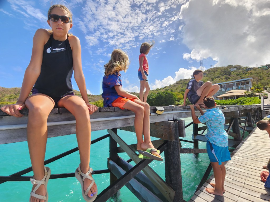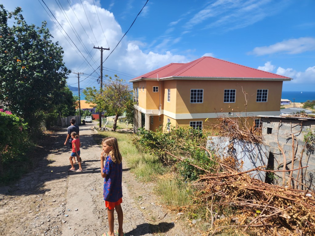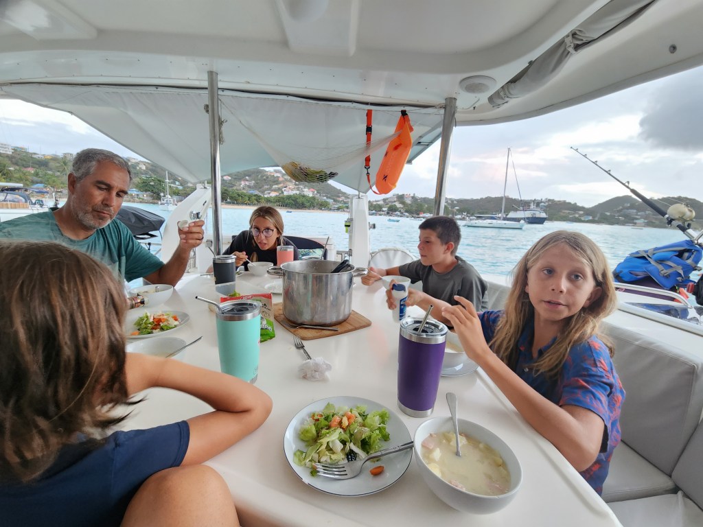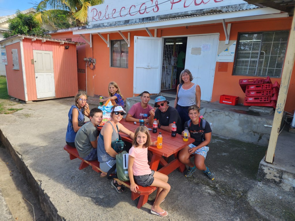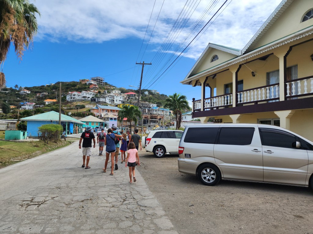 We went to shore to explore and possibly rent golf carts we had heard about. We got hassled by a local, who we came to found out is notorious for causing trouble. He called himself Baby Shawn. It’s a very nice town. People were quite friendly. We got some groceries and even some produce. We met another kid family from France. They are heading to the Tobago Cays now then heading North after so we might try and meet up with them then.