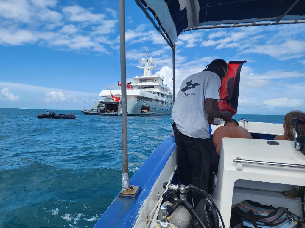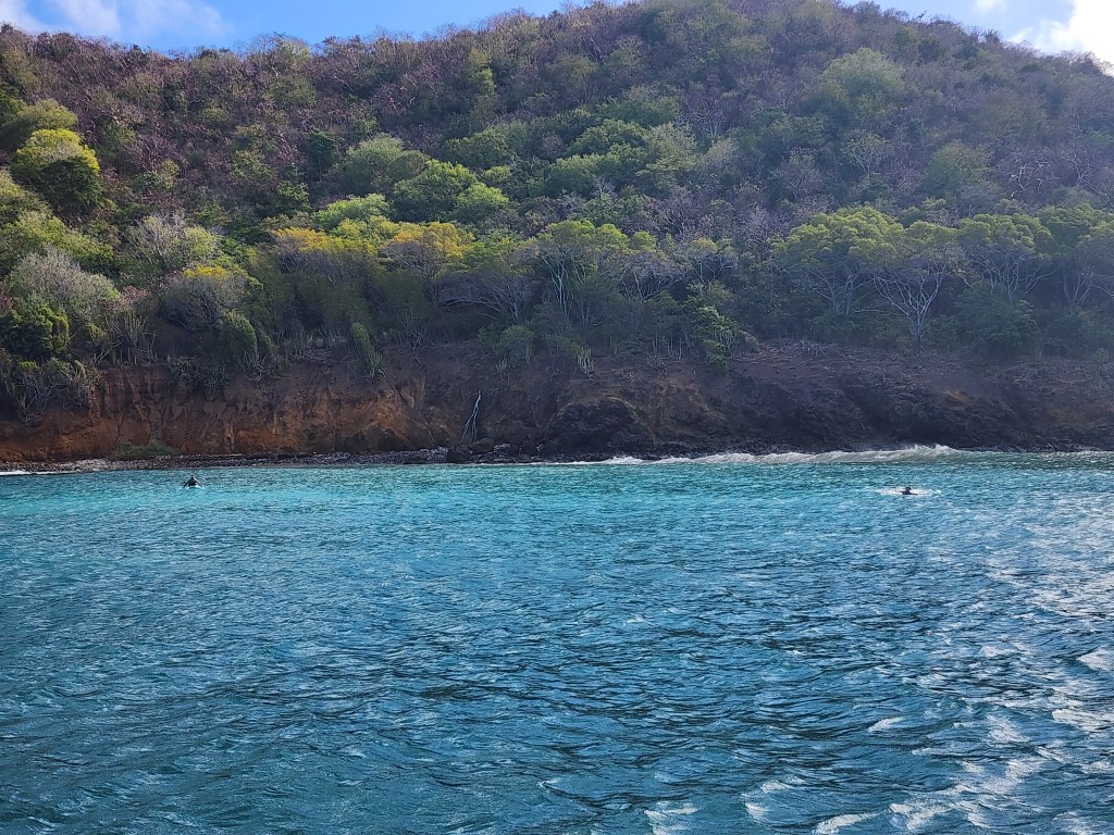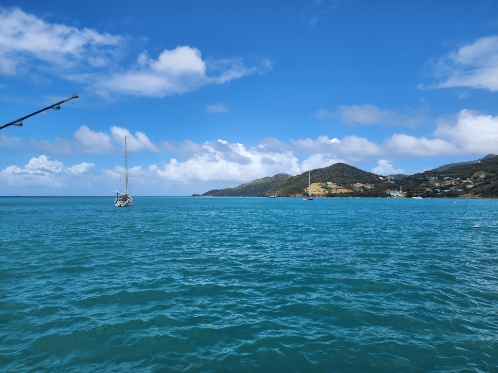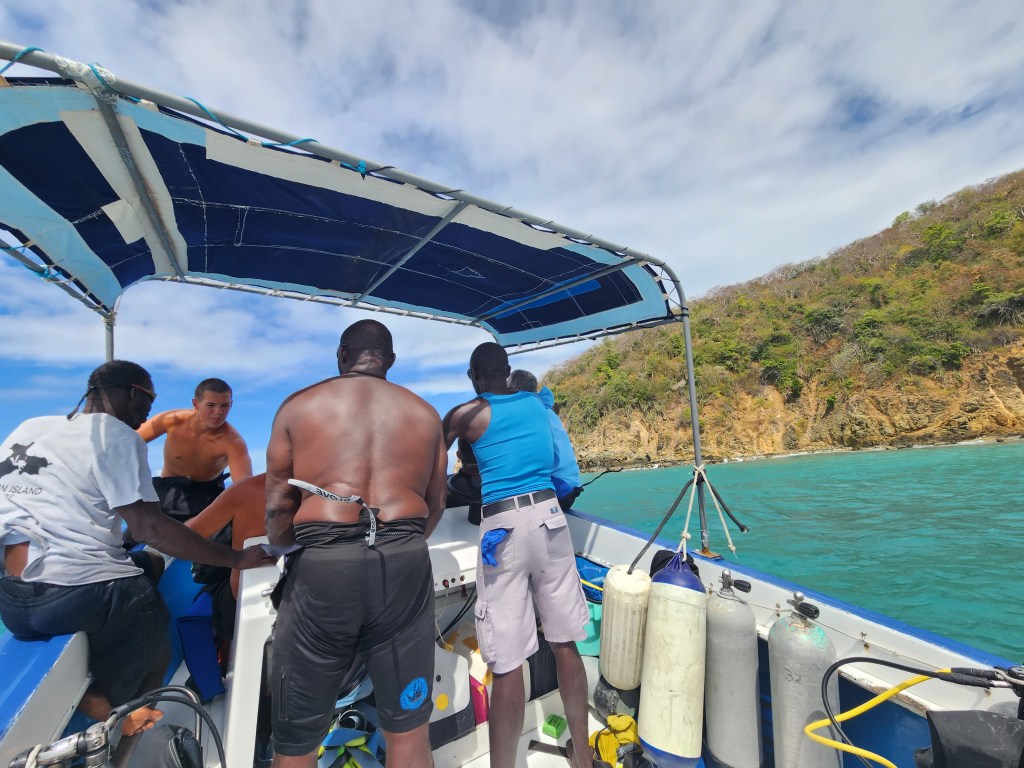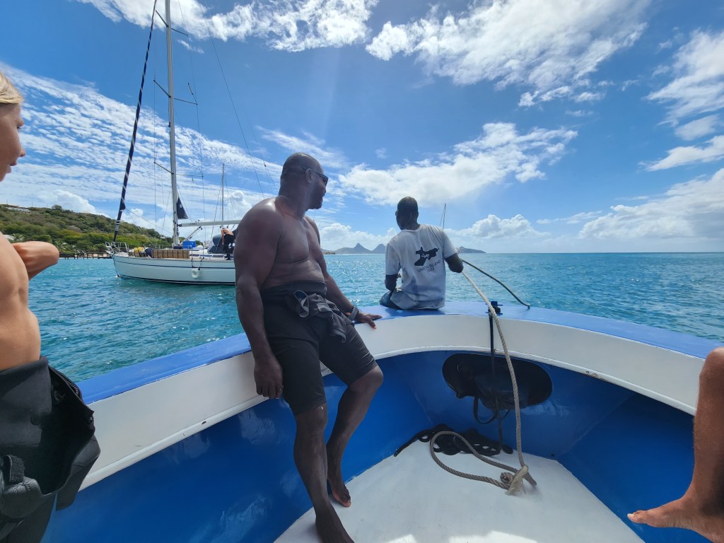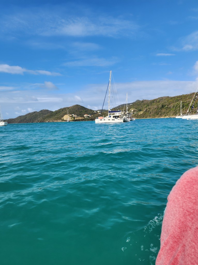 We headed out towards our next destination around 10. It was our biggest waves so far. 7 foot and some big wind gusts. We got moored pretty easily. We were planning to go to shore when we got a visit from the boat Alma. We had talked with them at Frigate about Starlink. They had some bad news. They had been anchored the night before and were having a drink at the beach when someone said a boat was dragging. They quickly realized it was their boat. Come to find out their anchor swivel had broke off. They came to ask if we could dive down and look for their anchor. Cale and Iian jumped at the chance. After 45-50 minutes underwater they still hadn’t found it. It was only in about 15 feet of water, but it was super murky and so dark they couldn’t see anything but about a foot in front of them. We spoke with the mooring manager later and he told us they might have been looking in the wrong spot. So, they might try again tomorrow.