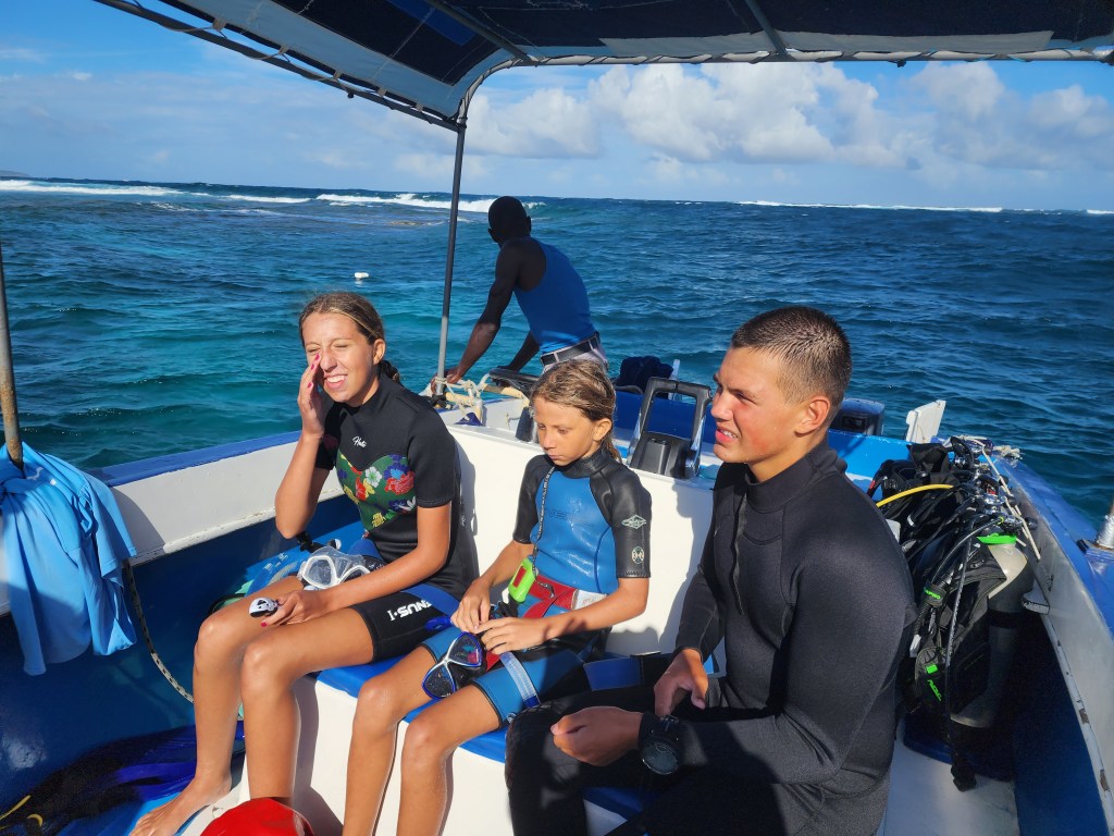 We got back to the boat and had lunch then the boys ran Kelsey to shore to stay with Nina while we did a scuba dive that Cale set up with a local company. We didn’t get exactly what we thought. We were in the park so we had to have a guide. They first spent about 20 minutes trying to drop off one of their instructors on a very fancy yaght. Then, they headed the wrong direction. When we asked they said we were going to horse shoe reef, which wasn’t what we expected. I think they went there so they could coordinate the dive with the fancy boat. We went to about 50 feet, but the visibility wasn’t great. We did see a big ray go by out in the deeper water that was really cool. We are all getting more confident. It has been a fun thing to do together.