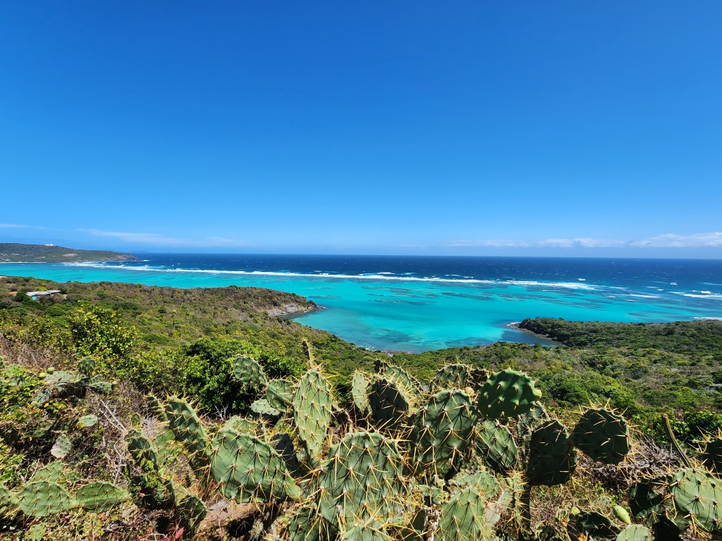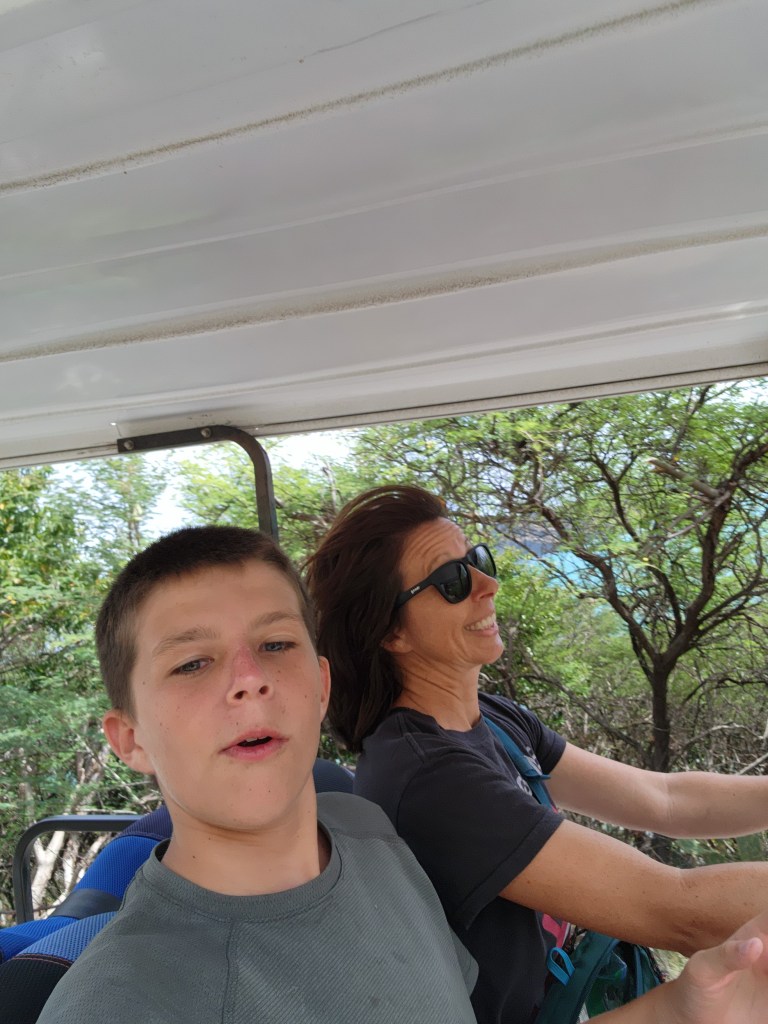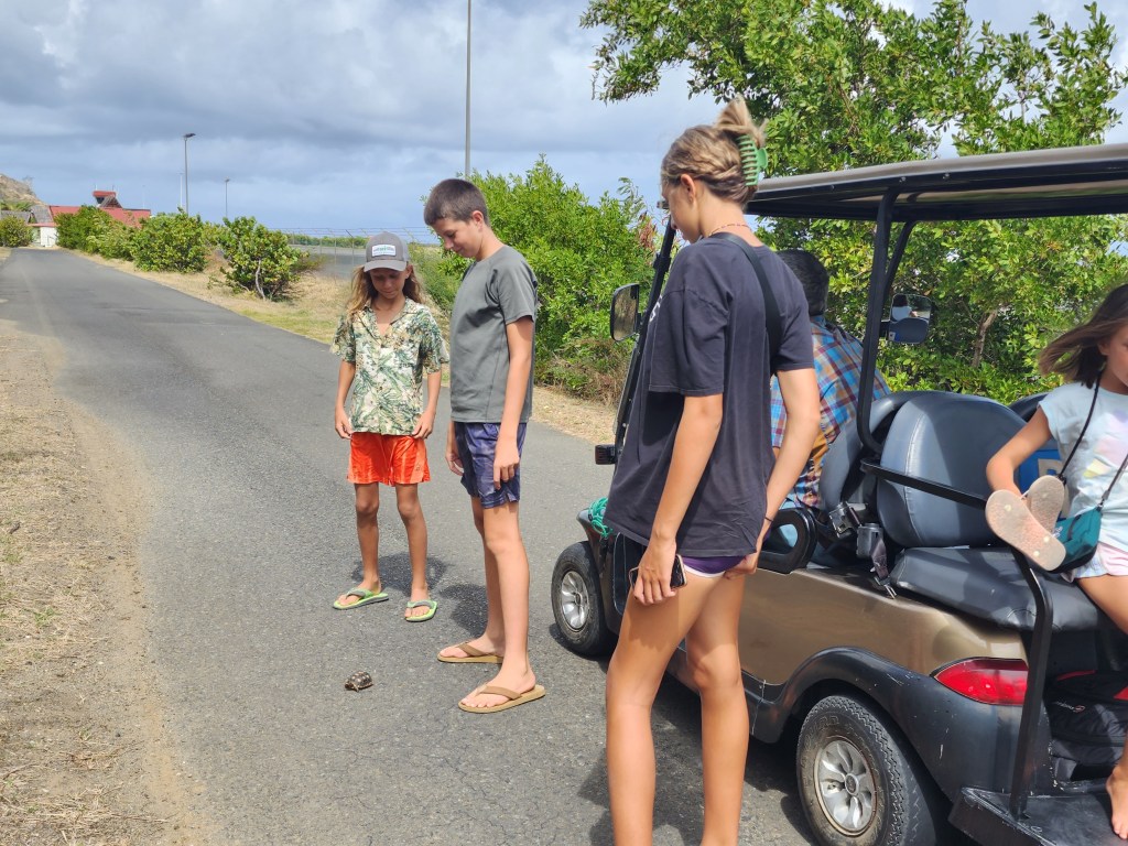 We saw and moved several tortoises off the trail, a tiny, medium and big one. The north side of the island is private but we went up and down all the other parts. The views from the other side of the island were amazing. The steep hills were scary going up and down. Our brakes were squeaking down all the hills and the motor was chugging to get us up the hills.