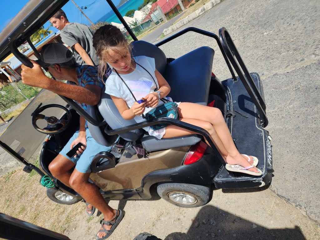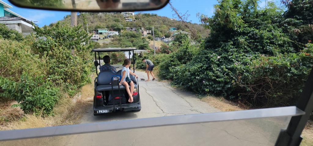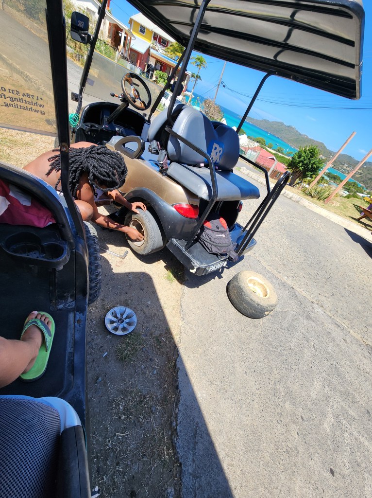We spoke with Gazimo on our walk yesterday about renting golf carts to drive around the island. After texting with him this morning we thought we had everything lined up. When we didn’t hear from him for awhile we called to confirm and he was going fishing. He said he thought he could get some of his guys to do it. We called back and his guys couldn’t. Cale called around and we ended up using King’s Concierge. While we waited to pick them up we did a church meeting. We talked about ways to love and worship Jesus and what that really means and how we really worship it can change us and help us to become better. The kids had been at each other and it was cool to see how it reset everyone. We got our carts at 10:30 and went for 3 hours then switched with Hold Fast 2 and Rapau. It was a really fun way to see the island. We started by going to the Sandy Island Marina. It was out of a movie. It’s so fancy and nice but almost completely empty. It was cool, but also weird. As we were driving to the other part of the island, Cale’s got a flat. We pulled off and called the owner. He said he’d send someone. As we were waiting, a man came up and said we were on his property. He was very nice and was happy to have us stay. A few minutes later, a guy hopes out of a car playing super loud music. He doesn’t say anything, just starts loosening the nuts. Then he just hops in his car and leaves. There we were sitting at a crossroads of old houses, a market, a metal building that had a roof about to fall out and electrical wires hanging all over. About 10 minutes later, he showed up, changed the tire, and left. We spoke to the man who lived in the home on the corner. He had 2 children, both now live in the States. He said he used to free dive for conch. 10 years ago, a man was mad at him and hit him in the head with a conch shell. He showed us under his hat he had a big divet out of his forehead. He was in the hospital for 6 weeks and didn’t really get compensation after that but couldn’t dive anymore.
