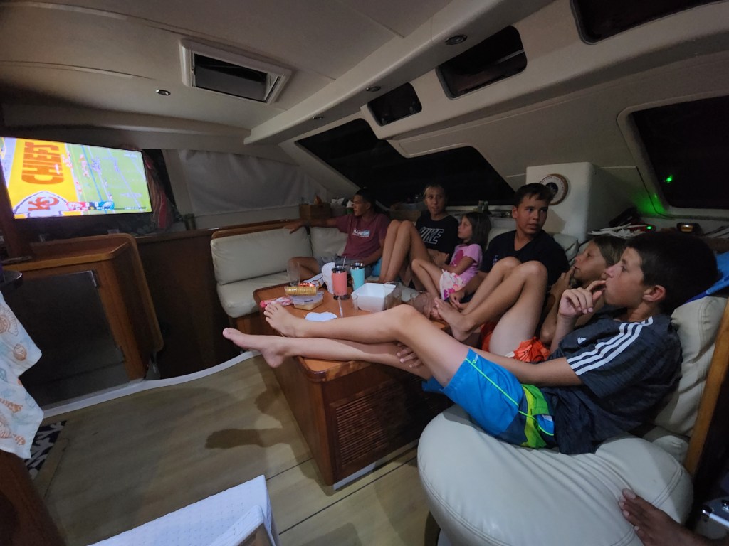 We gave the carts to our friends and came back to the boat for lunch. The boys and Kelsey worked on breath holding for free diving. We had dinner and then did some shuffling to return the carts. The boys came over to watch the Superbowl. They had never watched American football before so it was fun to explain it to them.