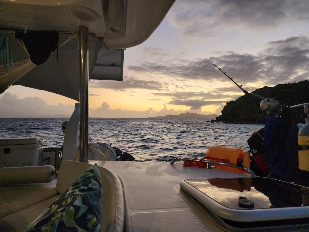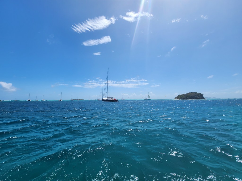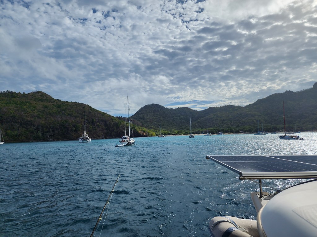 After taking down all the wet stuff we got underway. It was a pretty mild motor straight into the wind. The waves weren’t nearly as big as we thought they would be. Our approach was to come in North of Mayrou. As you approach it looks like you are going straight to one island but as you get closer you see there is actually a channel between 2 islands. The channel is lined with boats. It’s a pretty tight fit. We went around to the back side and found lots of moored and anchored boats. We started to get a mooring ball, but they were so close together we chose a different one on the east side of Petite Rameau There were 4. The first one we got didn’t look for very, but we ended up finding one that had pretty new lines. We are backed right up to land so we wanted to make sure we were secure. We also ran a back up line to the mooring ball.