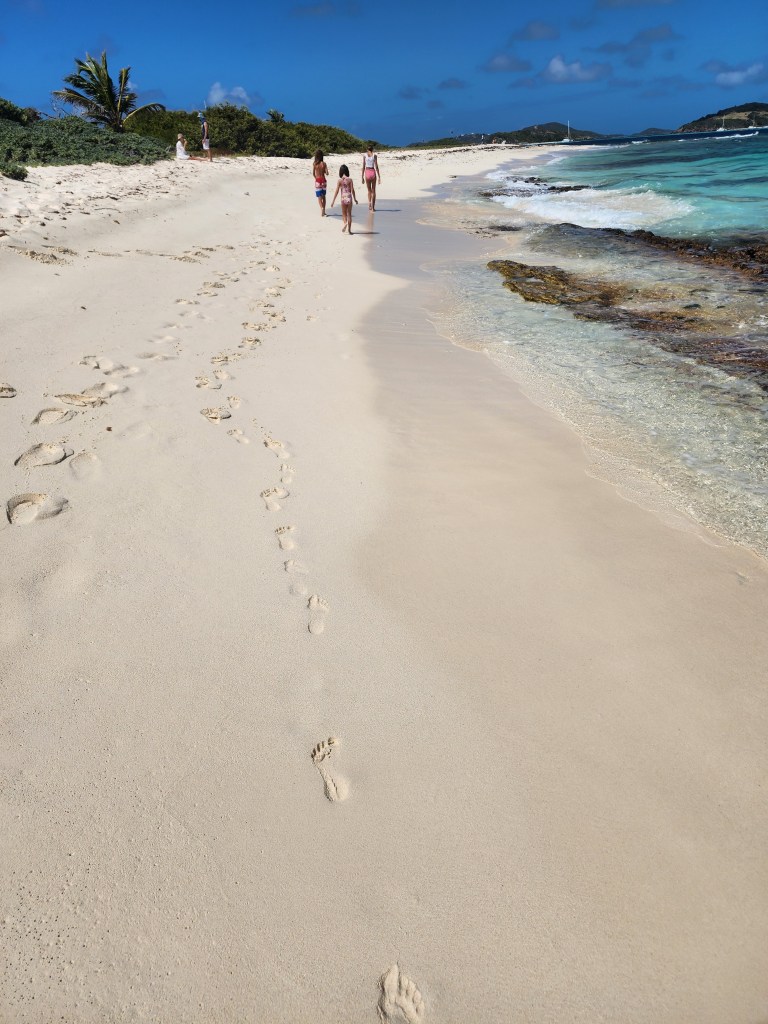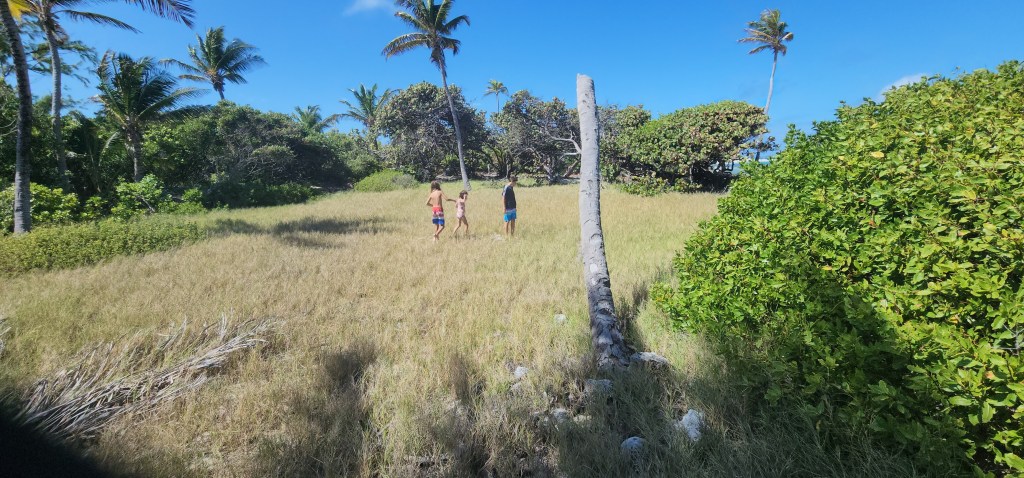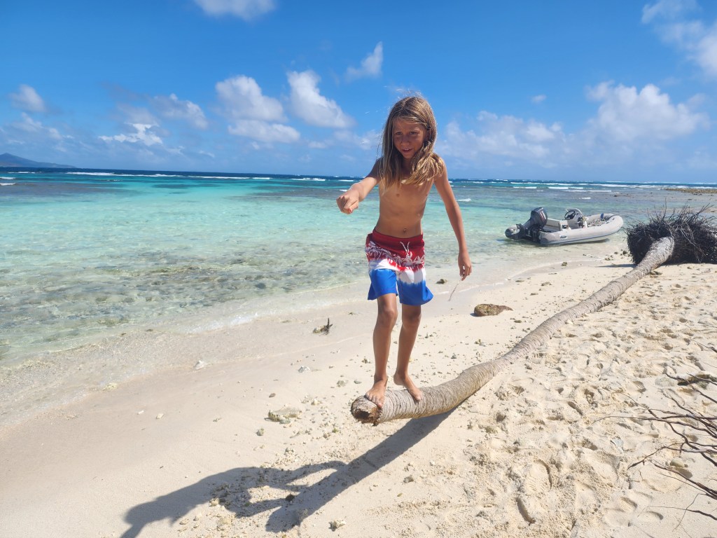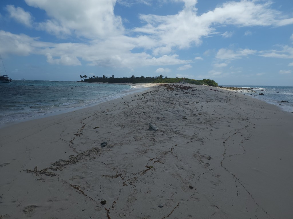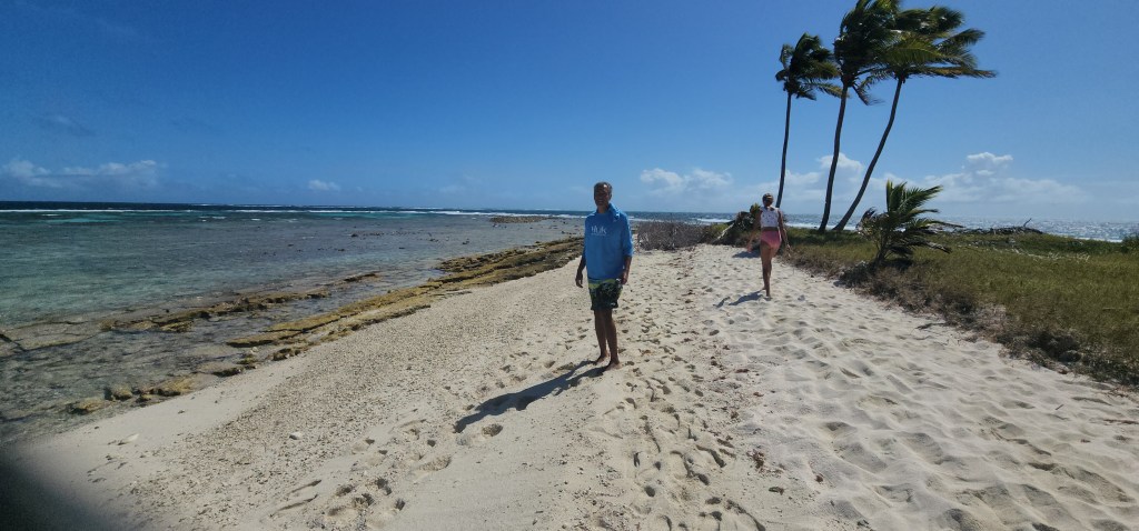 2-8 Our 2nd day in Tobago cays was one of my favorite so far. We took the dinghy out to Petite Tobac. There are buoys marking where to pass through because the water is coming in from the Atlantic Ocean and breaking on reefs everywhere. We were able to make it although we had everything tied to the boat just in case it flipped. I was glad for our bigger dinghy on this expedition. The island is famous because it is where they filmed part of the Pirates of the Caribbean movie. It’s the scene when Jack and Elizabeth are left on an island and he paces off 10 steps and finds his rum. We ran into a charter captain who was an extra in the movie. He showed us the spot where they dug up the area and put the box with rum. You can tell because when they put it all back they didn’t compact it so its depressed in the area. A lot of the beach has receded so it looked quite different. We loved this little island. It was so beautiful. We walked out to the point and ocean waters and currents are coming in from all directions. As we walked back along the water Kira spotted a shark just a few feet from her. We all got to see it in the surge before it darted away. We think it was a small black tip reef shark. The obvious next step was to hurry and get our snorkel gear and head out to hopefully see it. No luck but we did have a good snorkel. It was like a maze of sandy bottom and reef.