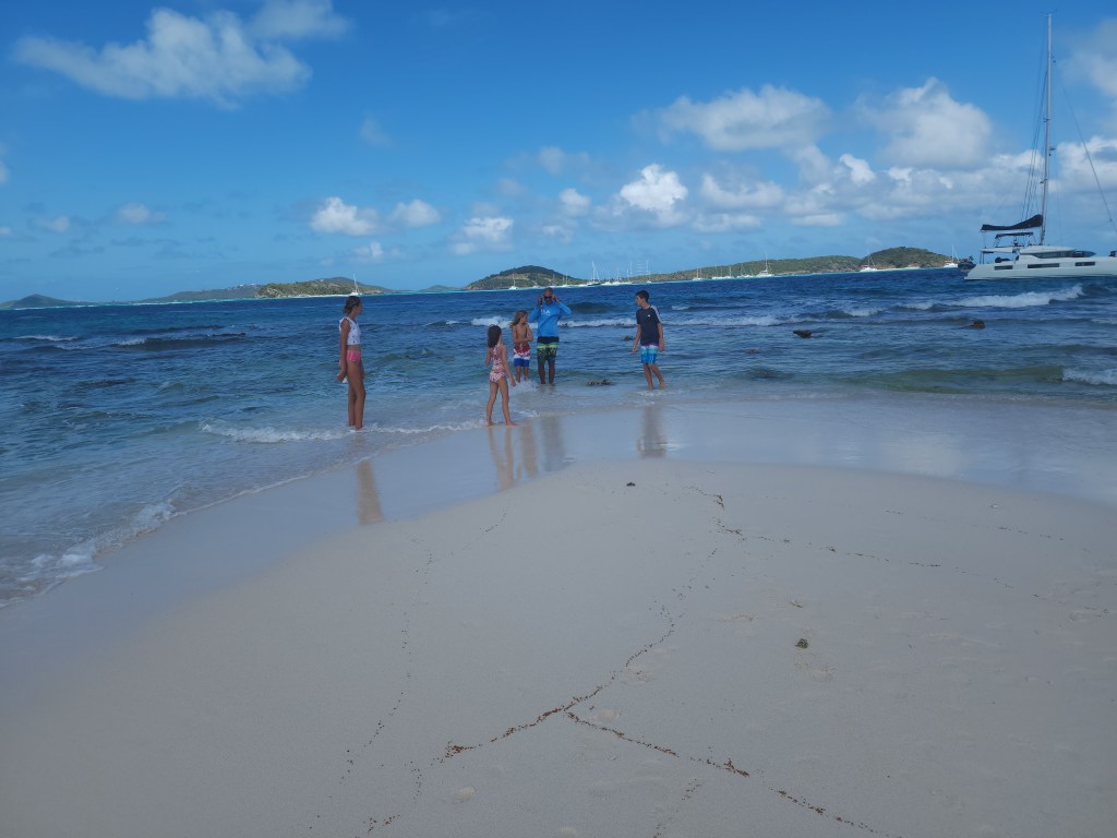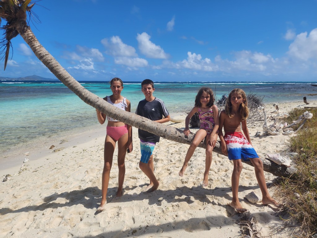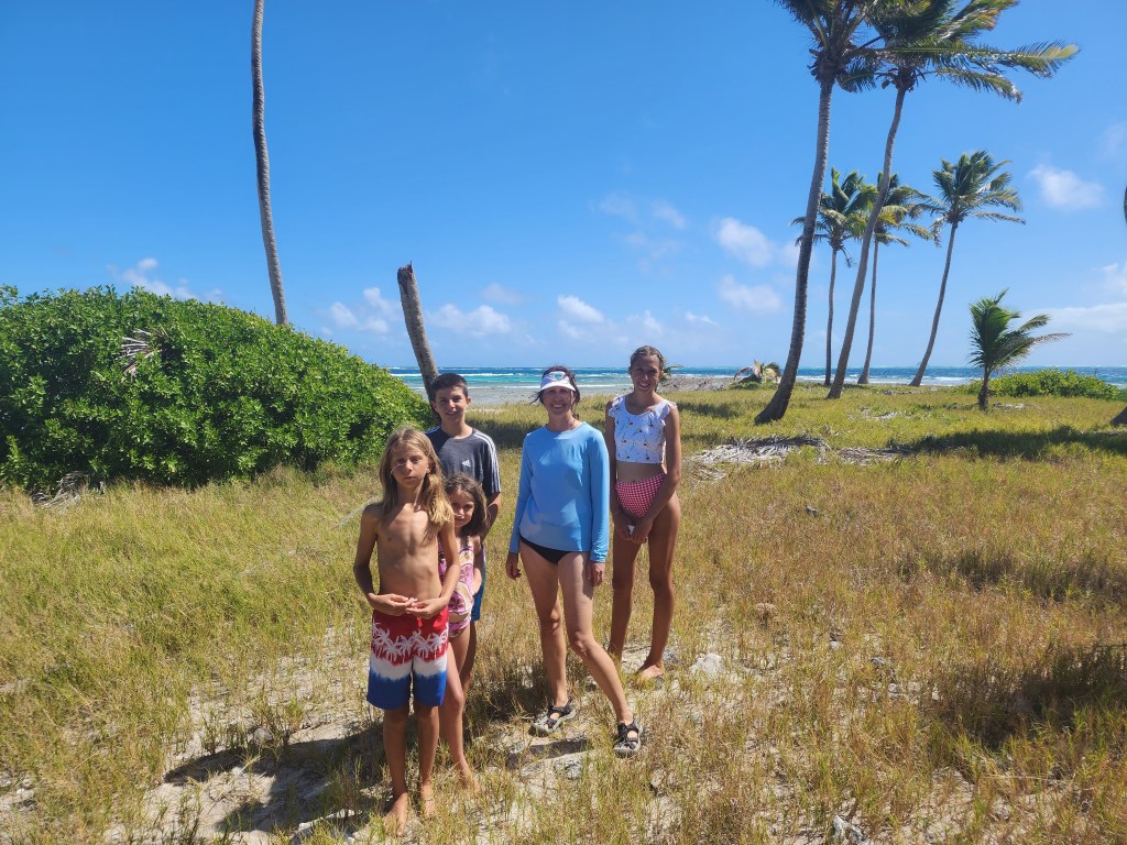 2-9 We had to leave Tobago Cays because the wind was really going to start picking up and there is no protection from it. We had a pretty rolly night. The kids woke up and did school. When we went to put the dinghy up last night one of the shackles were missing. We figured it most likely came loose and fell to the bottom. They are usually on pretty tight so it seemed unlikely but the alternative was a one of the boat boys stole it, but that seemed less likely. Cale jumped in and sure enough dove down and there was the shackle and carabiner. We were so glad we found it. They are not cheap parts to replace.