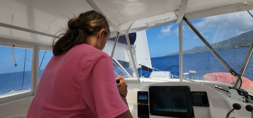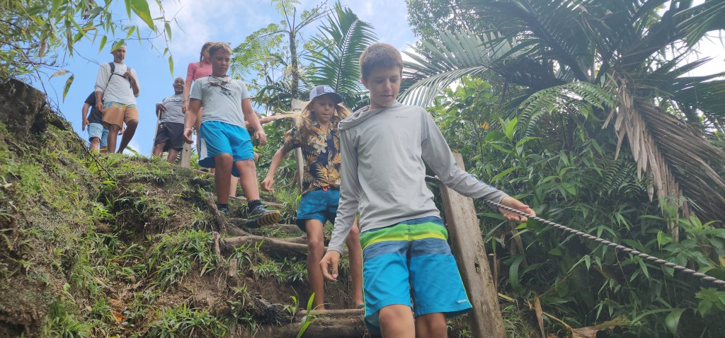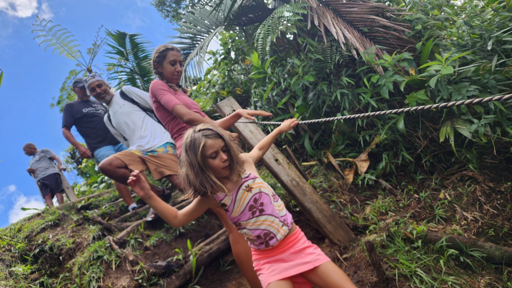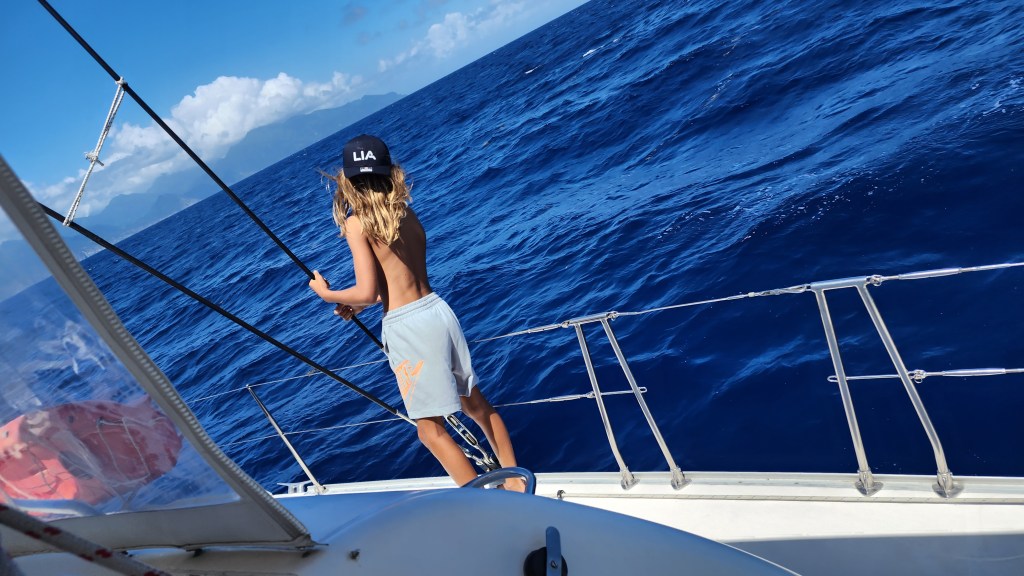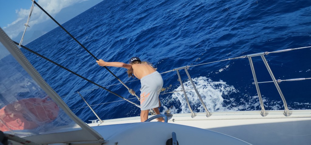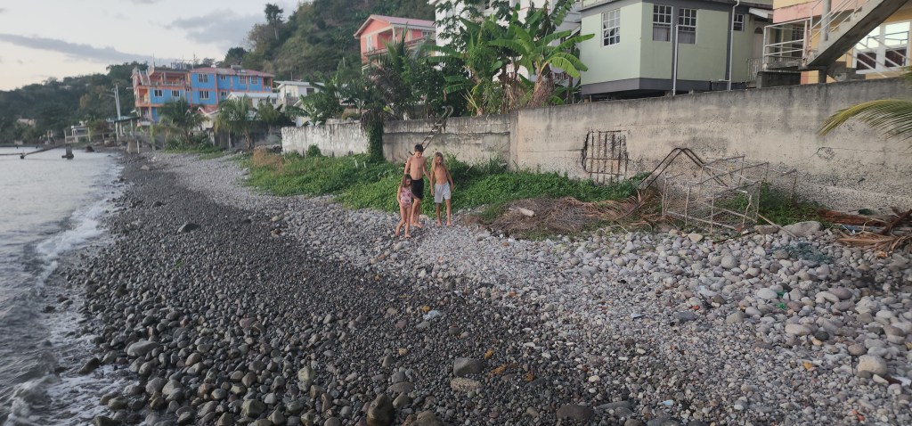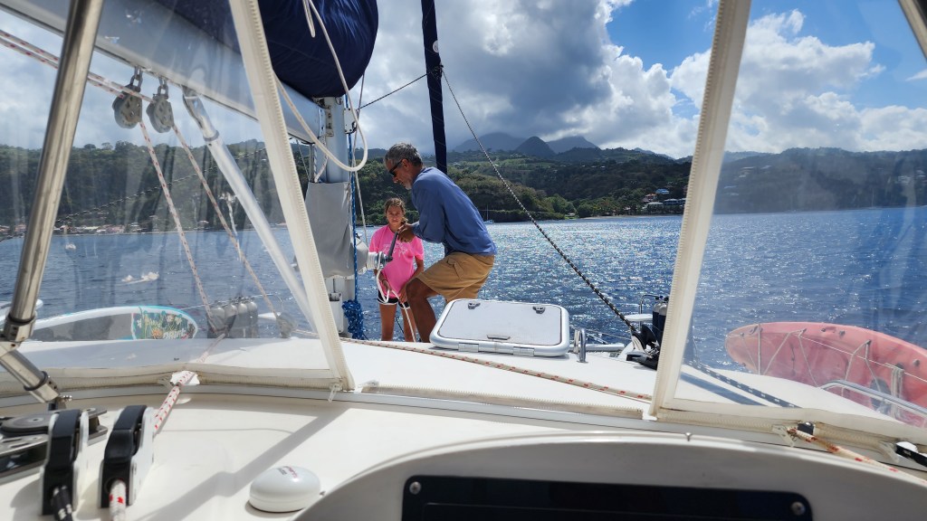 I drove off the anchor and Cale helped the kids run the anchor. We were able to put the sails up almost right away. We were going really good and then when we got behind the volcano the wind just completely died for about 30 minutes and we motored. We were able to get going again with great wind and made great time, going about 7 to 10 knots. The seaside on Dominica is very pretty, steep cliffs and very dramatic. We got a mooring ball with the help of a boat boy with Seacat named Mr. Beans. He got us set up with a couple tours the next couple of days. We are excited to see the island. It sounds like there is a lot here. Cale went to check us in. It’s quite easy in Dominica. You check in and out at the same time and they just give you 2 weeks. It will be nice to not have to check out when it’s time to go. The kids tried to swim off the boat but quickly came out screaming due to jelly fish stings. There is not really a good beach here. The kids got a little bored for the first time in a long while and eventually came up with a making some kind of challenge which eventually had me taking them to shore to gather some rocks and sticks. Cale spent the majority of the evening tackling the new toilet pipes. He is replacing the lines in Kira and Cole’s bathrooms. We are hoping that will eliminate the stink that comes from those heads. We helped as much as possible but it’s a tight space. We cleaned the bathrooms really good after. Hopefully, the problem is solved. A boat called Tiger Lily came by. They are a family of 4 from Sweden. They are 7 months into their year of sailing here and then back to Sweden. They have 2 boys our boy’s ages. We are hoping to meet up with them soon and let the boys play.