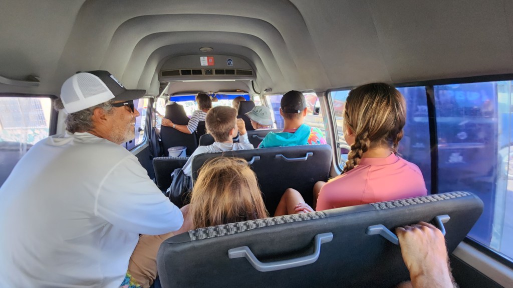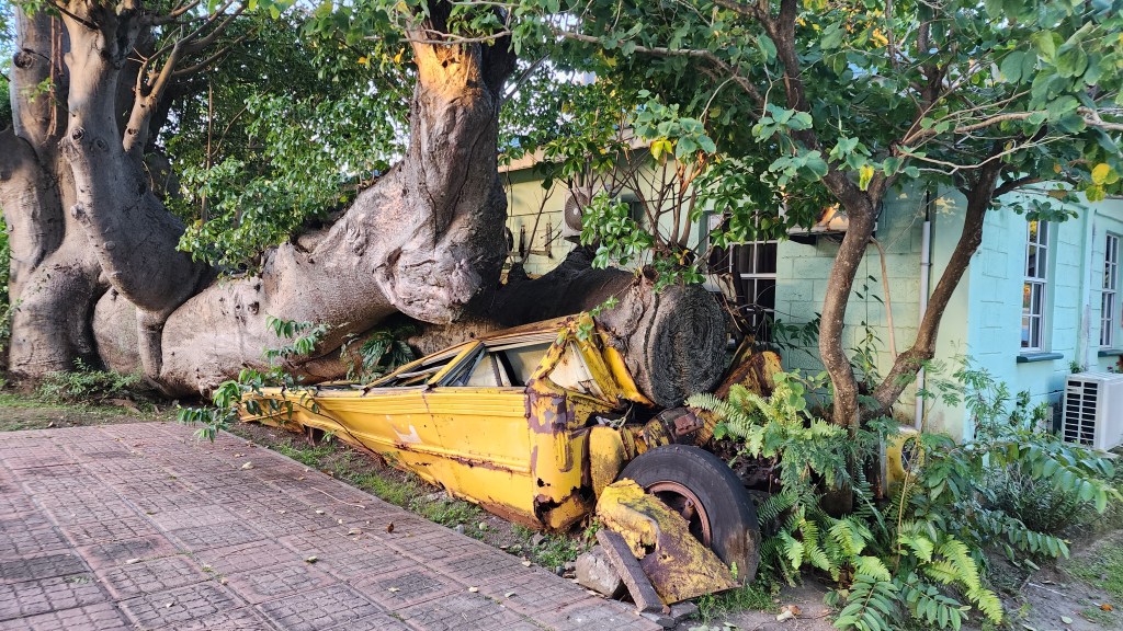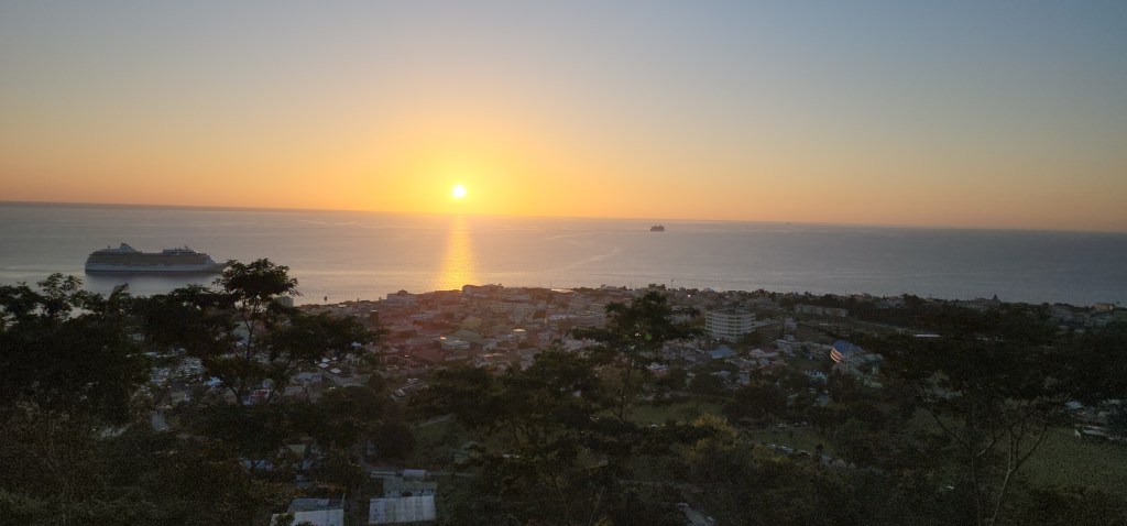 We drove by a place to see parrots on our way home. There was a park where people were out playing cricket and other games and hanging out. We saw a bus that was a gift from Canada and before it could be used it got smashed by a tree from a hurricane David in 1979. We made another stop to see the sunset at an awesome overlook and we think we saw a tiny bit of a green flash. We made a quick stop at a market and then back to the boat. A perfect, exhausting, but wonderful day.
