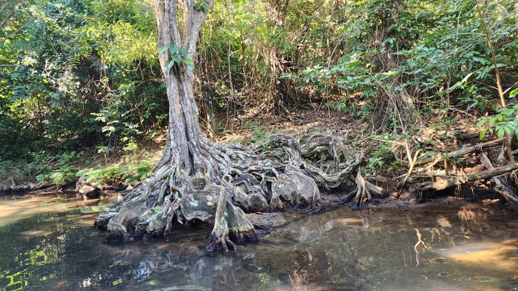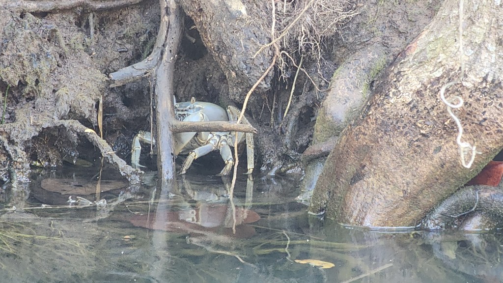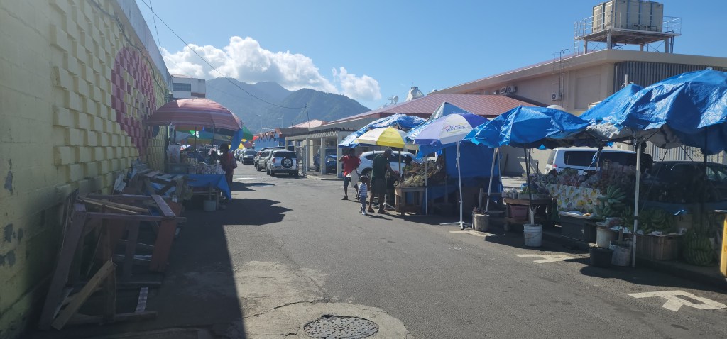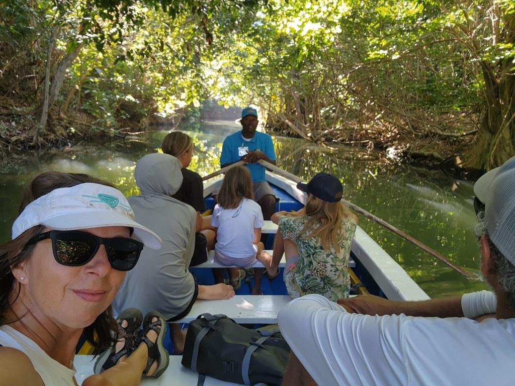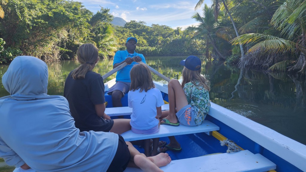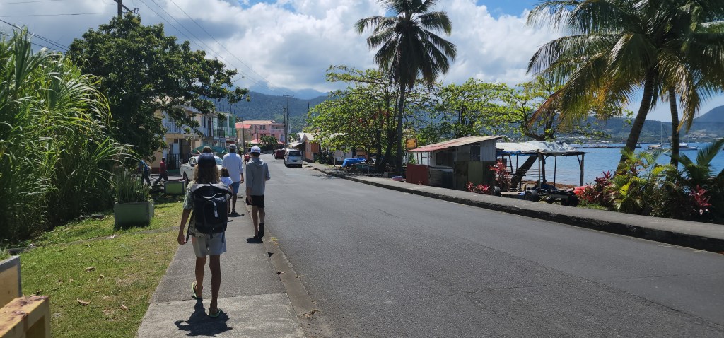Alexis with Pays picked us up at 8 for an Indian river tour. He used paddles to slowly move us up the beautiful river. It is the only place like is on Dominica where fresh and ocean water meet. There was a lot of wildlife, and bird, very old trees. Sadly, a lot of the river is still recovering from Hurricane Maria in 2017. We went up a small tributary where they built the place used as Calypso’s house in the pirates movie. Our guide said during the filming they would bring them up in their boats in all their make-up and ready to film. We saw a lot of crabs that lived at the base of the trees. Several white heron birds. At the end, before we turned back around, there is a small restaurant. We had some bay leaf tea that is made from bay leaves and ginger. It was very good. We got back to the boat at around 10. Cale and I then had to lift out the washing machine from Cole’s room. It was heavy! We went after that to shore in Portsmouth to walk around and get lunch. We were approached by several people for food and money. They weren’t super pushy, but it was very sad. We got lunch, roti, at Rays roti. A family owned place for 20 plus years. It was really fresh, tasty roti.
