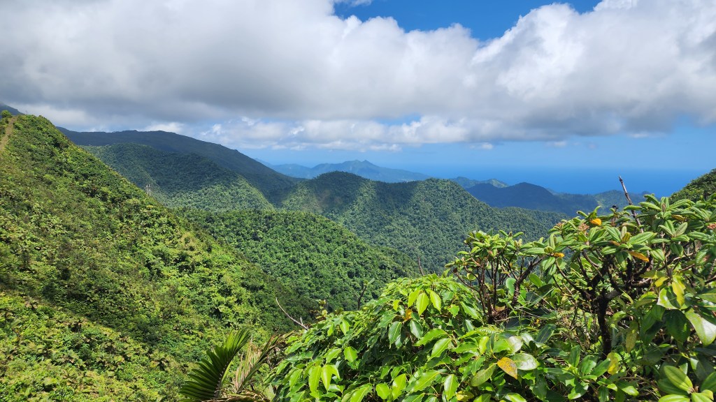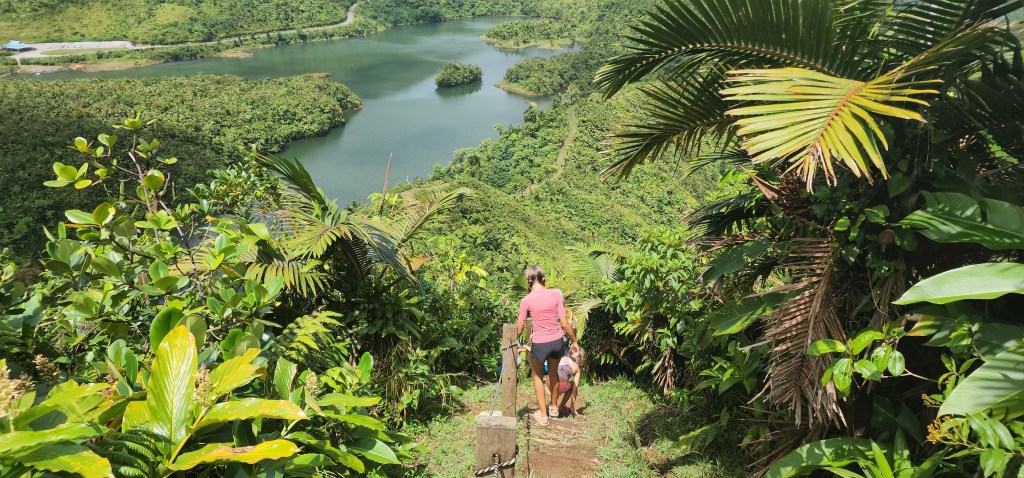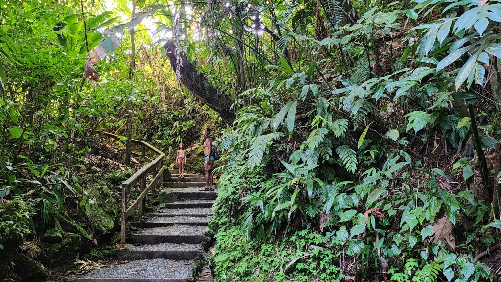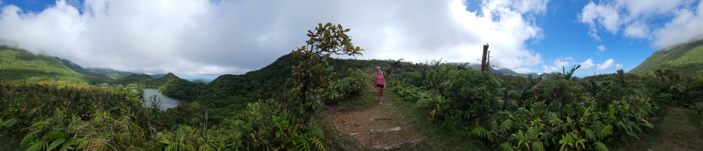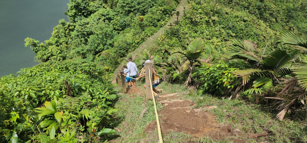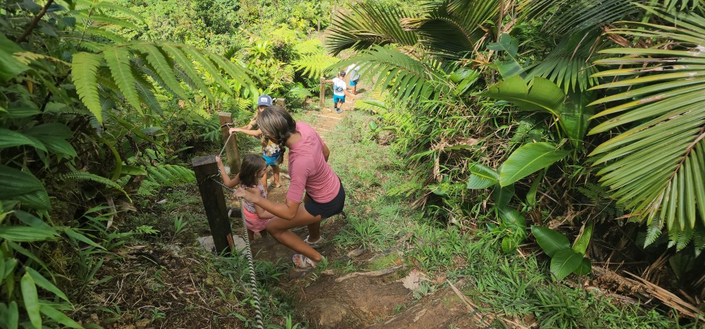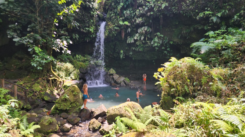 3-7 We met Stowe (stowaway) aka Armstrong at the dingy dock at 9am. We really didn’t know exactly what to expect. He first took us to town near where the cruise ships come in to let Nina and Jackie check in and get cash from the atm. We walked around the few food vendors that were open. We then drove up, up, up. We ended up over 2,700 feet. The views were absolutely amazing. So green, so lush, so steep. The roads were actually quite nice because they widen them for a geothermal energy factory they built. There is a big pipe, covered in wood to keep it looking natural, that runs from the water fall/ lake down the mountain. There are some tight turns and steep terrain. Our guide got out several times and had us taste, smell, and learn about various plants, seeds, nuts they grow here. The lemongrass or he called it cannabis smelt so good. My other favorite was the cocoa seeds. They tasted like a slimy jolly rancher. I couldn’t believe it was cocoa. If you bite into it, its bitter and that’s the cocoa that they dry, roast, and grind up. We tried some and it was really good. Passion fruit was also really good, with mixed with a little sugar. The flesh is seedy and gooey, but has a good sour flavor. Our first stop was the National Park fresh water lake. We bought our park passes then started our hike. From the building, we went right up and around and came back on the road. It was quite steep, but had nice big steps. It was really amazing. You walk right along a ridge and feel like your on the spine of a dinosaur going up, then back down, then up again. We were all pretty hot and excited to jump in some water and cool off. Little did we know how cold our next stop would be.