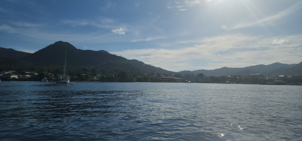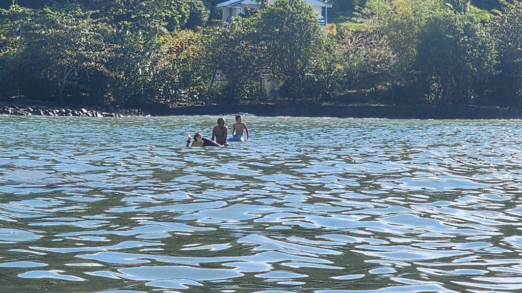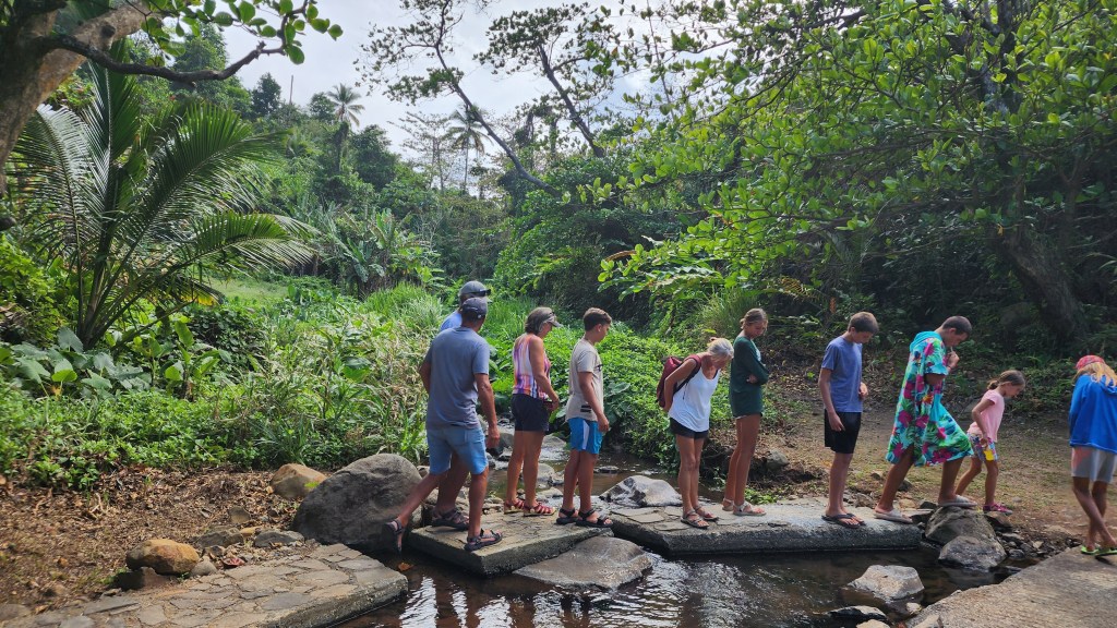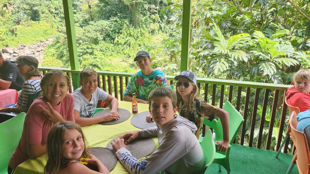 We left Roseau around 9. Before we left we checked in with Nina and Iain and gave them our old radar and some of our extra towels for their guests they have coming. It’s weird to be saying goodbye and that it could be for a long time. They have to get their engine looked at before they know if they will come up to Portsmouth. We discovered last night that Dominica is a very popular whale watching place. We decided to try and find them on our way out. We followed some watching boats out but we just weren’t quite fast enough. Several times just as we got close, they dove and the boats dispersed. We tried and tried. We did get close enough once so see a big one dive down. We are hoping we still might see them when we leave here in a couple days. We got to the mooring at Portsmouth at 1:30. Our boat boy is Alexis. He got us set up with a tour to see the 2 rivers tomorrow at 8. Kira worked on homework. Cale, Kelaey and Cole took the dinghy to check out snorkeling spots. We worked on cleaning the boat. I made dinner and worked on re-stringing the trampoline. It was a pretty laid back evening, which was needed after our 2 busy days in south Dominica.