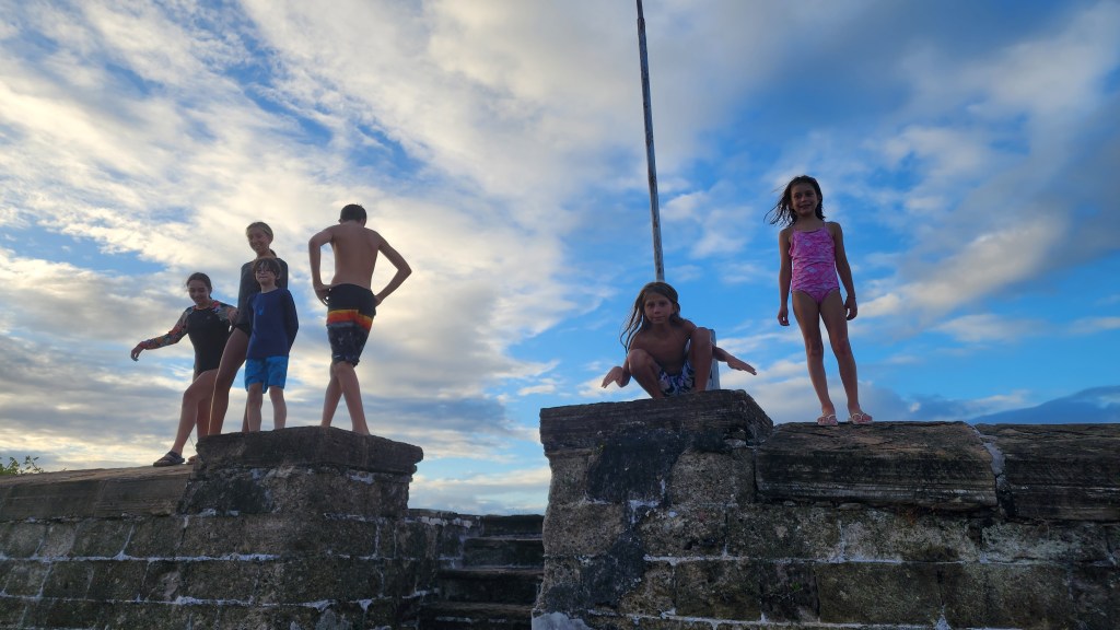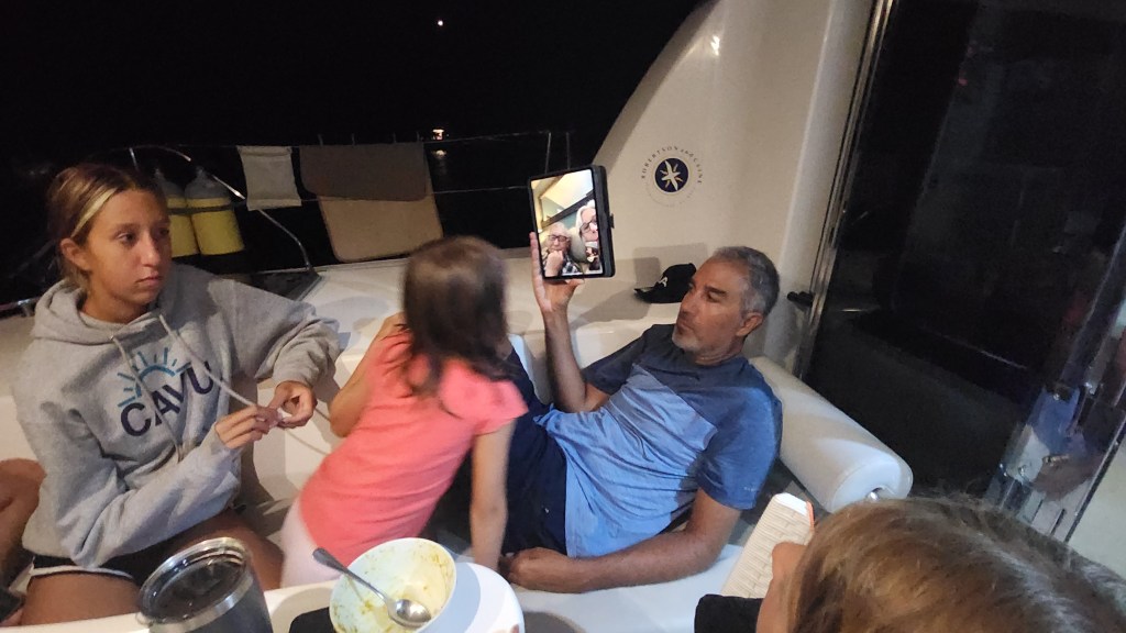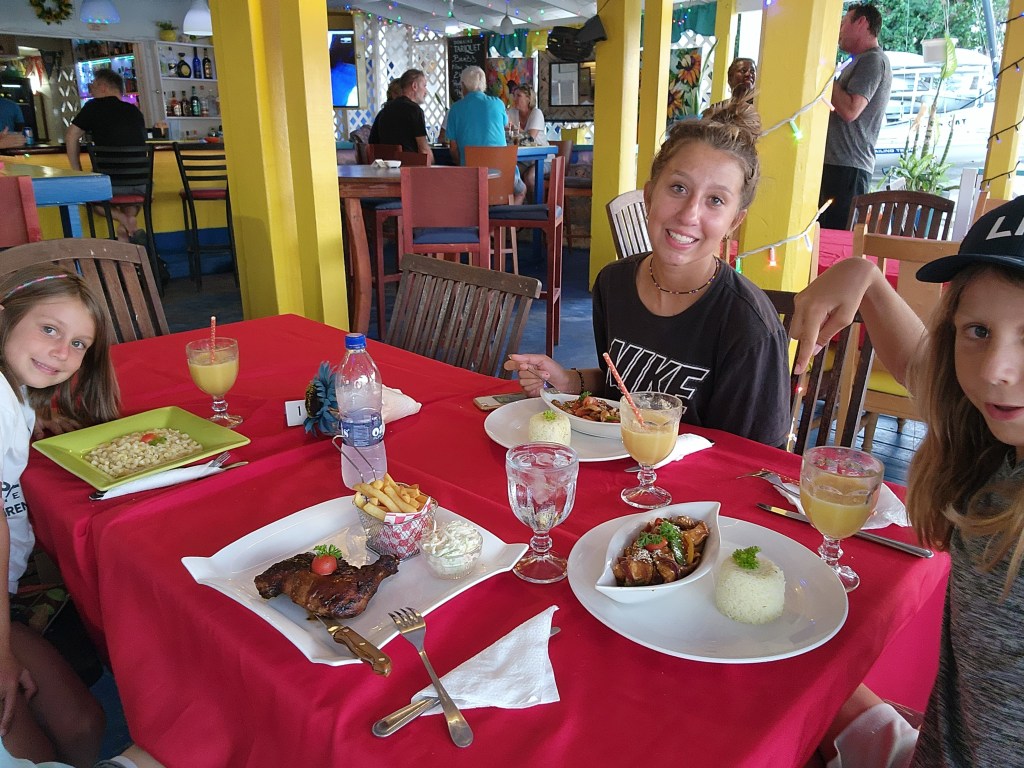 Cale went to pick up a refrigeration guy to fix one of fridges that stopped working a couple days ago. After he fixed it Cale took him back and went to customs and got checked in. He said it was a long process. A lot of forms and then filling out the forms online. Not very efficient. The kids and I cleaned, cleaned, cleaned. We mostly focused on rooms. Cole’s knee is still hurting him quite a bit. He kept it iced. Cale, Kira and Kelsey played hide and seek. At one point Kelsey and Kira hid in the dinghy. Cade came back and said ‘the dinghies untied’ in a panic. When he saw Kira and Kelsey in there he laughed and laughed. He finds joy in everything.