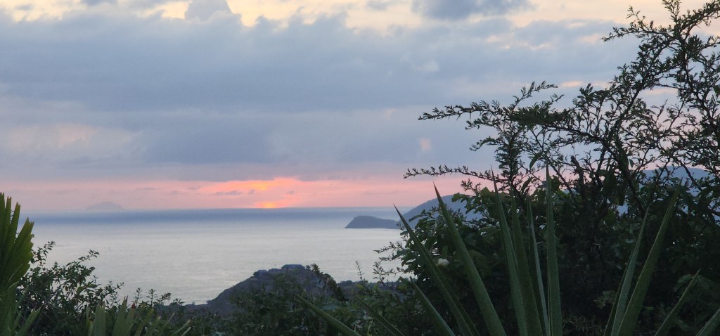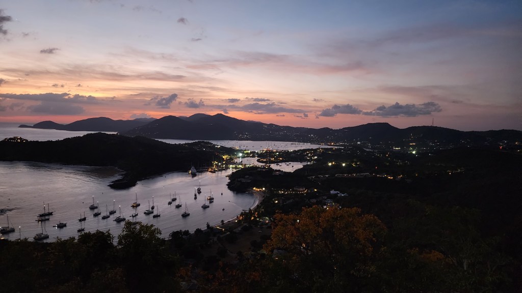 Cale, Kelsey and Cade went to pick up the Westers in our rental van. They got to the boat about 4:30. We got ready and drove the rental van to Shirley heights for the Thursday night BBQ. We got to hear the steel pan and reggae bands. It was very organized and the food was so good. The kids hiked down the path to town for a bit. There was also a mongoose in the trees behind were we sat and ate. The views were far reaching to all parts of the island. A lady chastised the kids who had gone on the other side of the rocks when we had our backs to them. She said in a very thick British accent, “be careful.” We came home and watched the BSU game. So sad that they lost!!!!