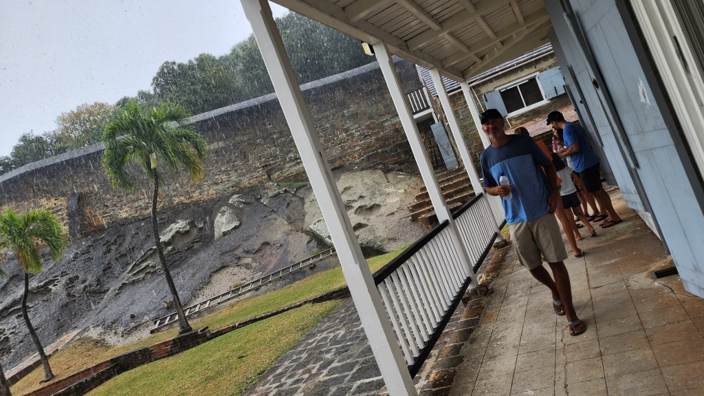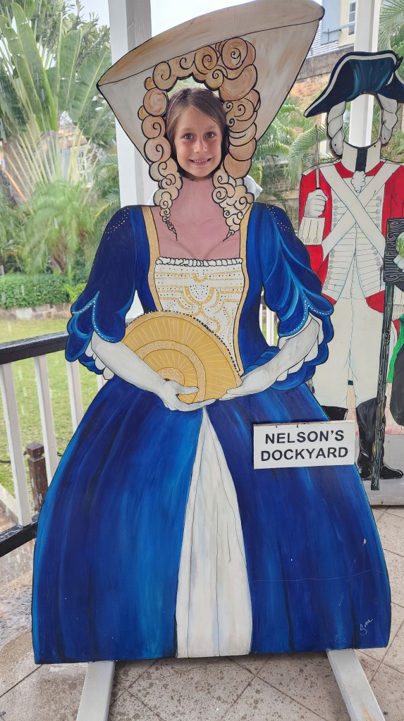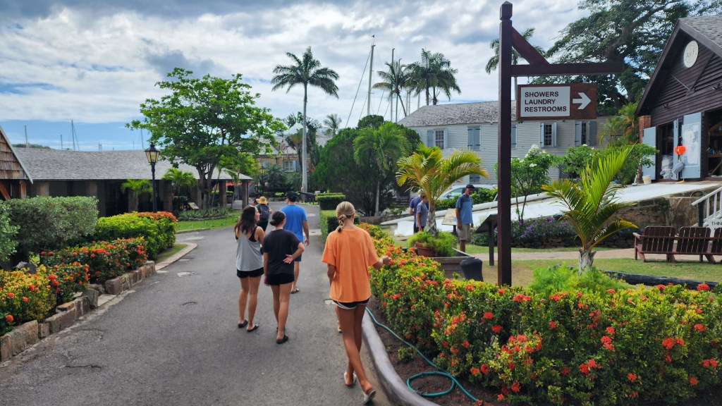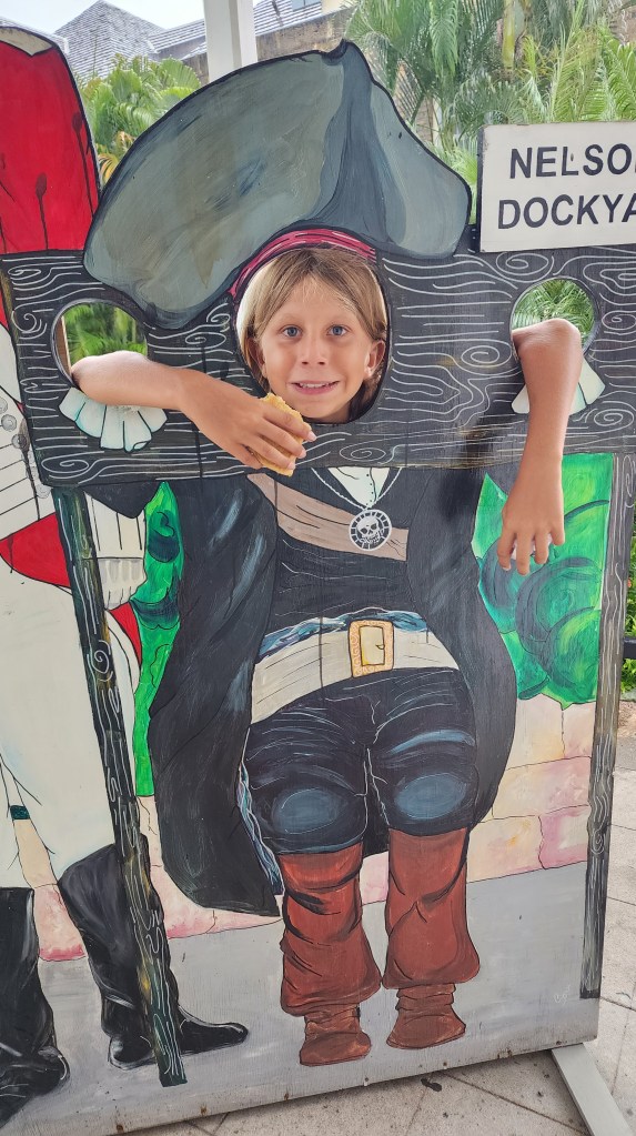 We woke to a very calm mooring at Falmouth Bay. The adults went to shore to get groceries. Our first stop, Genny Supermarket, was supposed to be the best store on the island but it didn’t have much at all. We went to another store that looked much newer called The Covent Garden. They had a great selection. Prices are high but not terrible. Hard to know for sure since it’s EC. We went back to the boat and unloaded groceries and all went to shore. We walked to Nelson’s dockyard. While we were in the bakery it started pouring. We passed more time by going back to the museum. It was really interesting and so sad. Hearing about all the stuff that happened to the slaves is so sad. There is an organization called Eight. They started for 8 names of slaves that were written down who died in an explosion. Their mission is to uncover names of slaves and also to help people reconnect with ancestors.