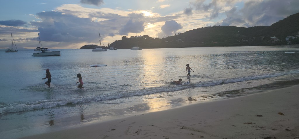 Back to the boat and then a 45 minute head sail to Carlisle Bay. We had rain on and off all day, the first time in a long time we’ve seen any rain. It’s kind of refreshing but I’m ready to see the sun already. The boys went to look for a surf spot. The girls played on the paddle boards. When they got back we moved closer to the resort beach and then had dinner. We dinghied to shore. They had these fun round mats in the water the kids played on and we walked the length of the beach. The waves going out from shore and into shore were equal in size and crashing into each other. It was a very interesting thing to watch. I don’t think I’ve ever seen anything quite like it.