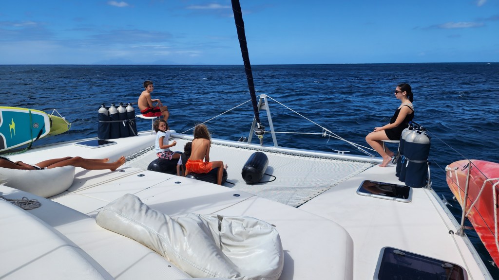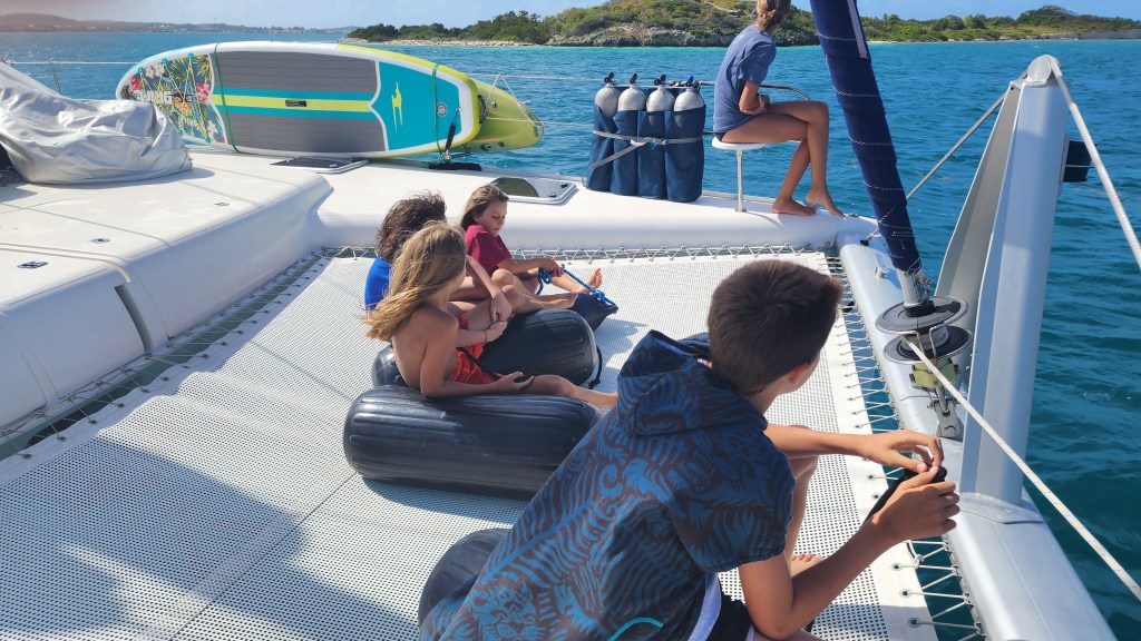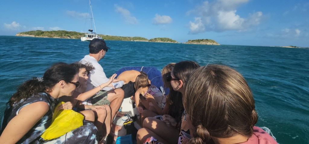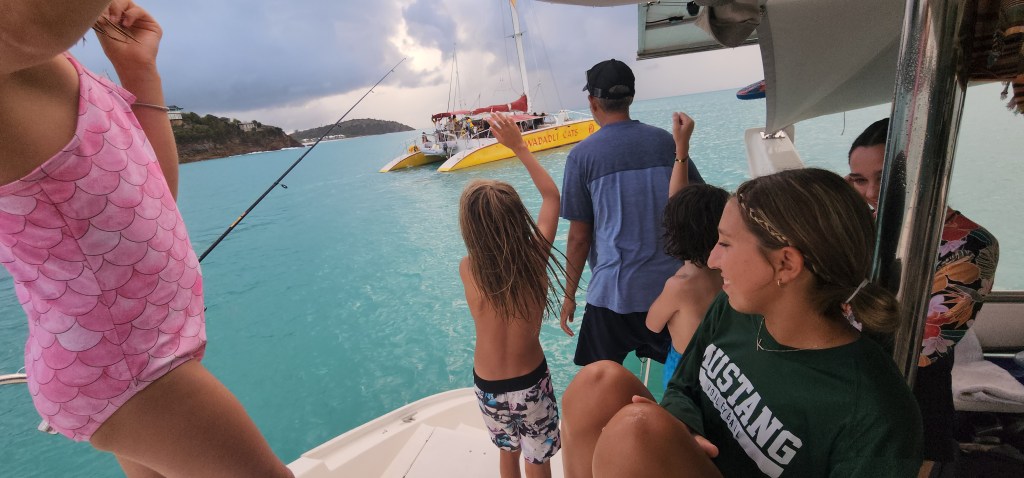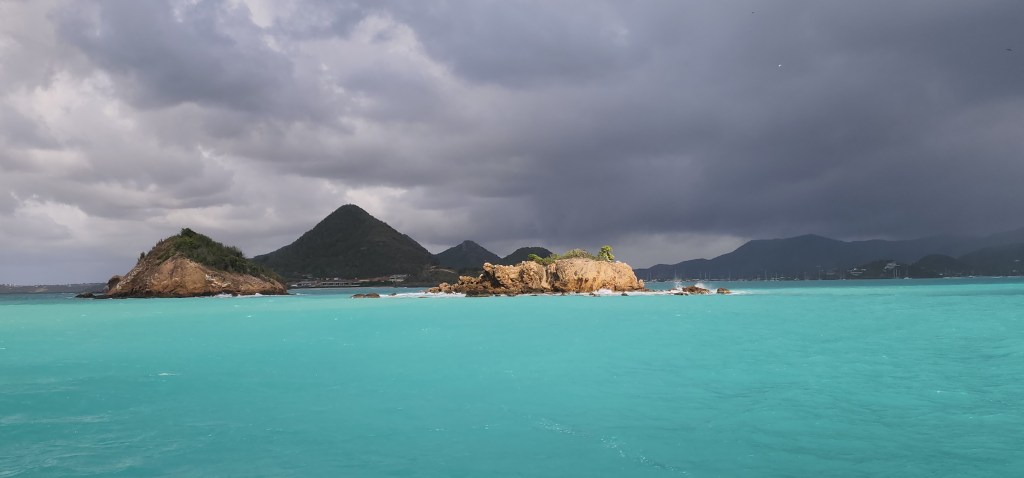We got back to the boat and after lunch left the mooring for Deep Bay. It started to pour as we came in so we just circled around for 30 minutes waiting for a weather window. We finally ended up doing it with light rain, but it stopped shortly after. It’s a beautiful spot. The water is murky from the rain and rough seas. There is a crash you can snorkel on. We are hoping it will clear up so we can do it tomorrow.