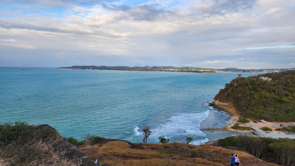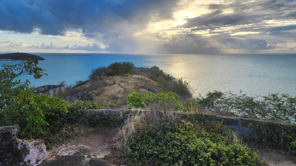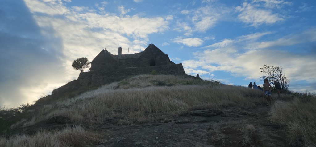A party cat came by and they loved CadeWe went to shore. We were all standing around and I wanted to hike to the fort. We all started heading up. There was a family on the beach and one of the ladies, Stacy, said “Hi. Do you remember me? I met you at church.” She was very nice. She decided to hike up with us. It was very much meant to be. It was nice to get to know her. She joined the church in December, but said she knew for some time it was the right thing to do. Her mother, son, and sister also joined. She works on a 6 star resort were lots of famous people go. She is in charge of the youth activities at church and has a personality and smile that light up everything. The hike up was short but steep. One part even had a rope to help you get up. It wouldn’t have been hard except most of us, including myself, was in flip flops. The fort itself was really cool. We aren’t sure of the history, but probably British. There were small rooms and a big flat spot with a flag pole on top. The views were amazing. You could see St. John’s, the main city, the salt ponds, the ocean and many islands all around. We could even see St. Kits and Monserratte in the distance.
