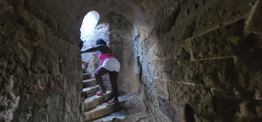 A party cat came by and they loved Cade’s dancing so much they backed he boat up and danced some more. It was pretty funny. We went to shore. We were all standing around and I wanted to hike to the fort. We all started heading up. There was a family on the beach and one of the ladies, Stacy, said “Hi. Do you remember me? I met you at church.” She was very nice. She decided to hike up with us. It was very much meant to be. It was nice to get to know her. She joined the church in December, but said she knew for some time it was the right thing to do. Her mother, son, and sister also joined. She works on a 6 star resort were lots of famous people go. She is in charge of the youth activities at church and has a personality and smile that light up everything. The hike up was short but steep. One part even had a rope to help you get up. It wouldn’t have been hard except most of us, including myself, was in flip flops. The fort itself was really cool. We aren’t sure of the history, but probably British. There were small rooms and a big flat spot with a flag pole on top. The views were amazing. You could see St. John’s, the main city, the salt ponds, the ocean and many islands all around. We could even see St. Kits and Monserratte in the distance.