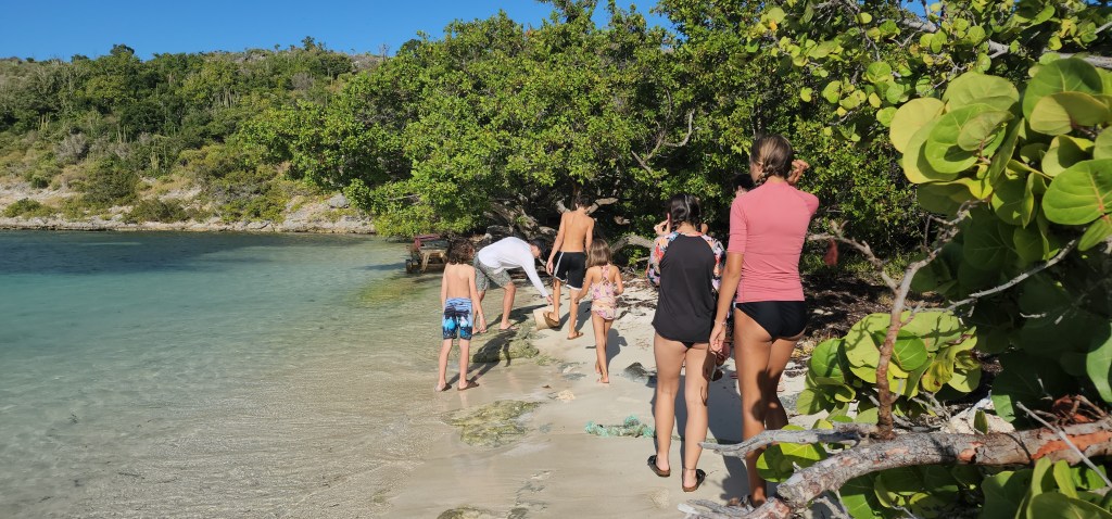 3-20 The kids went to Deep Bay beach with josh and Anne. They had a blast playing in the waves, collecting shells, and skim boarding. Cale and I tackled the toilet, yet again. It was full of water from when we tried to get it pumped out. We got it to drain out but there was still a couple inches in the bottom. We tried and tried to get it to flush out but it won’t. We put more vinegar in there and are hoping it works its way out soon. We left Deep Bay mid-day. We were sad we didn’t see the wreck because it was too mirky and bad visibility. It was about a 2.5 hour boat ride to Great Bird Island. It’s between the north of the island and a Reef. There is good protection from swells but still quite windy. About 18-20 knots. The kids love playing a game they made in which they try and stay balanced on the fenders on the trampoline. It was lots of fun until they broke some of the trampoline line. I’m hoping to replace all the line soon. We got anchored and dinghied to shore. There is a staircase you can go up, but it was closed. We walked around. This island was the only island that the racer snake survived. They went extinct in the whole Caribbean when mongooses were introduced to keep the rats out of the sugar. It was brought back from extinction here. We didn’t see one. We tried snorkeling but it was very shallow. A second spot wasn’t as shallow but still wasn’t great. We came back for pizzas.