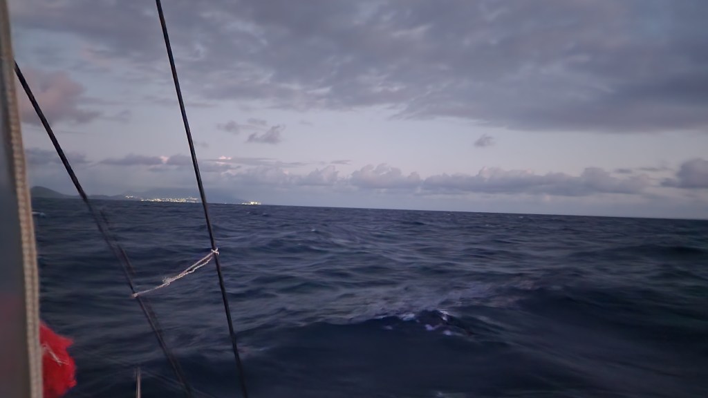 3-25 Our overnight from Barbuda to St. Kitt’s started about 9. I slept until about 12, but not very good. Josh relieved Cale at 1:00. I went up shortly after to check in on the kids, then probably around 2 it started to rain so I went up and had the kids go inside. I started my shift at 3:30. Kelsey had just gone up with a bad dream and thought Josh was Cale. She was half asleep and then I came up. She slept and hung out with me. When it started getting light she woke up some. She said she wanted to see the sun come up. It was directly behind us and sadly covered by clouds.