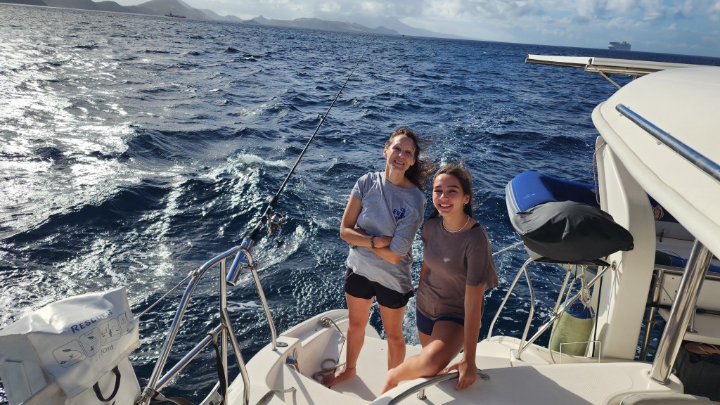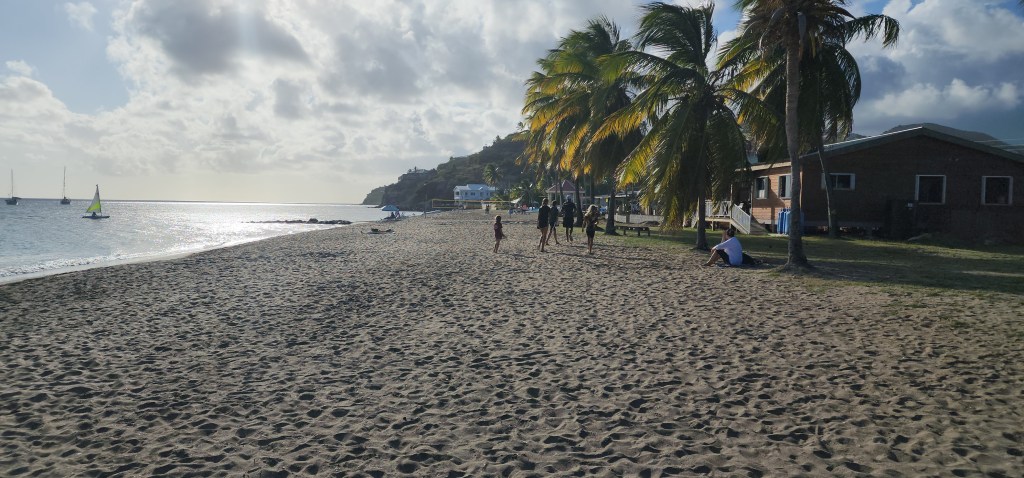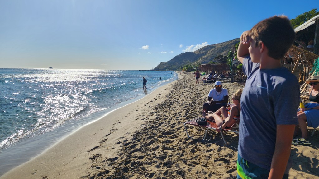 We dinghied back to the boat and Cale took a nap, since he was still feeling a little sick. We ended up moving to Frigate Bay, just a bit south. It’s a pretty bay. There were rows and rows of beach chairs they were putting away from the cruise boats. This island definitely sees a lot of cruise boats. We tried to walk to a rental car place but the map wasn’t quite right so we just came back to the boat and had a light dinner before an early bed.