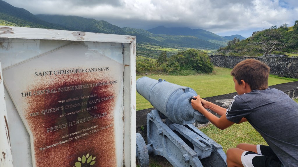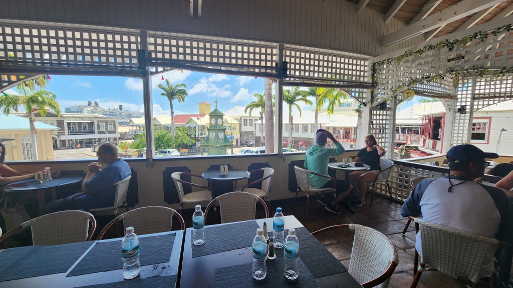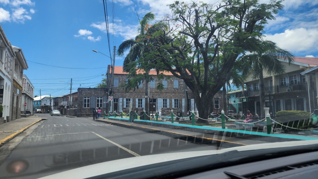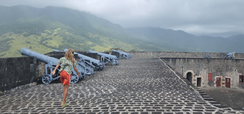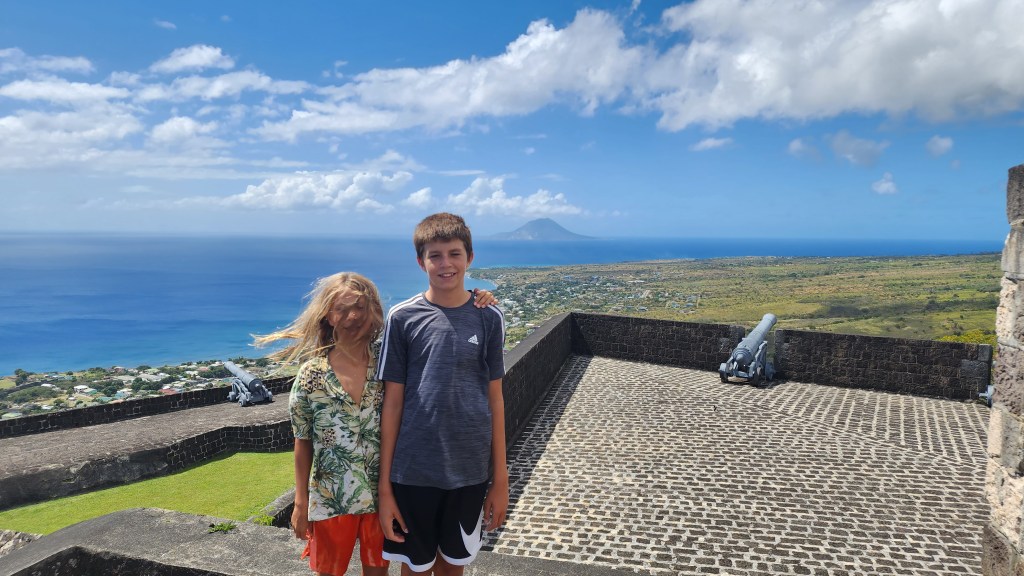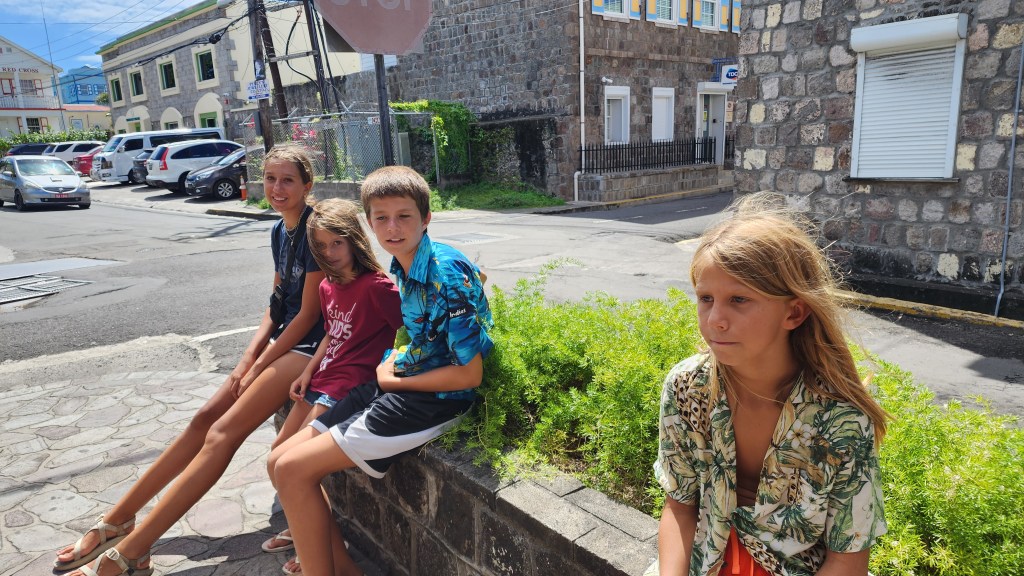 We got anchored at Basse Terre. It was right next to the cruise ship terminal. There were 3 huge ships there. Cale and Josh went to shore to check in. The kids played cards. Customs came by in their boat with their lights on. I explained that the captain was still ashore and they left. They came back when Josh came back in the dinghy. I explained he wasn’t the captain and they left. Then, I was out front trying to take down the Antigua flag because it was all tangled and they came again and said ‘put up your flag.’ I explained I was trying. They were very persistent. We went to shore so we didn’t have to deal with them again. We loaded all the Wester’s bags up and met Cale on shore. St. Kitts looks super cute from the shore. Bright colored buildings. It was nice on shore but very cruise boat feeling. We walked through the busy area and into the historic part. There is an area patterned after Piccadilly square in London called the Circus. We saw that. The town has a lot of French and British influence. It changed hands several times. It’s also burned down in the late 1700s so a lot of the town is from that time period.