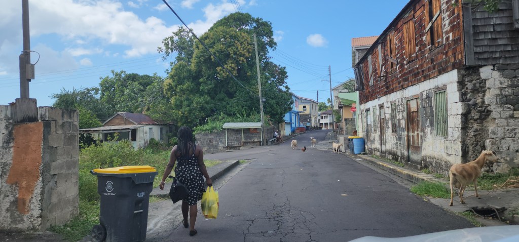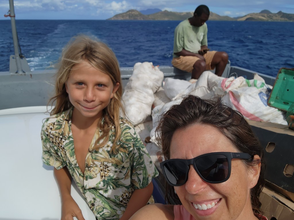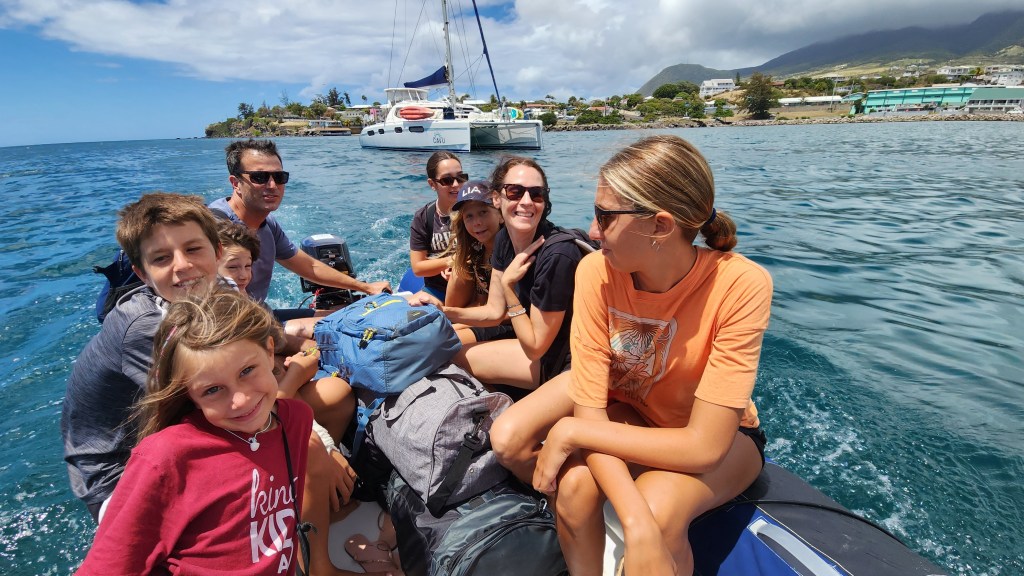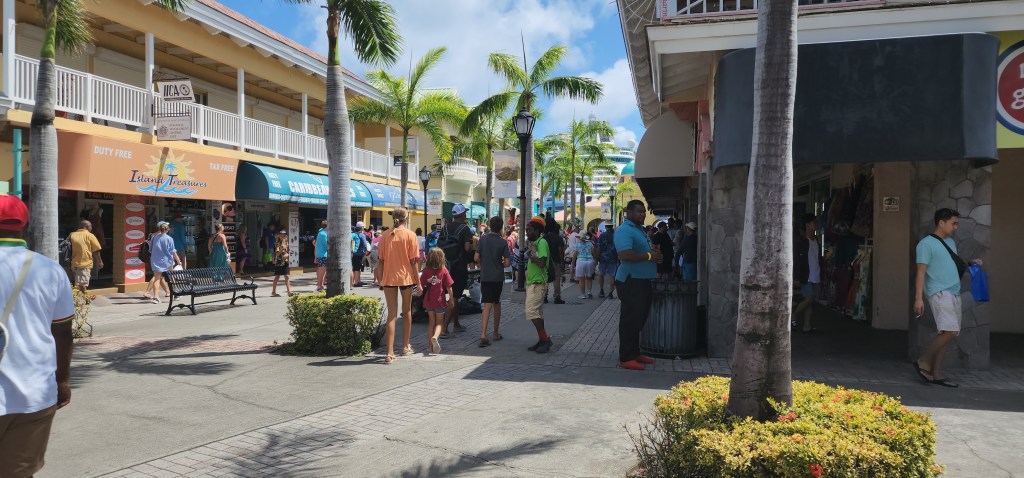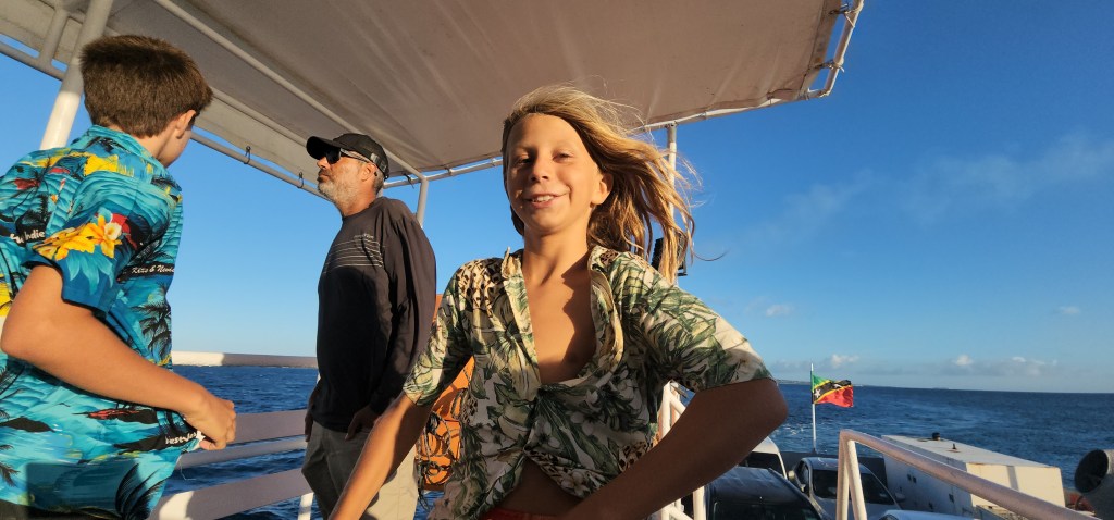 We got anchored at Basse Terre. It was right next to the cruise ship terminal. There were 3 huge ships there. Cale and Josh went to shore to check in. The kids played cards. Customs came by in their boat with their lights on. I explained that the captain was still ashore and they left. They came back when Josh came back in the dinghy. I explained he wasn’t the captain and they left. Then, I was out front trying to take down the Antigua flag because it was all tangled and they came again and said ‘put up your flag.’ I explained I was trying. They were very persistent. We went to shore so we didn’t have to deal with them again. We loaded all the Wester’s bags up and met Cale on shore. St. Kitts looks super cute from the shore. Bright colored buildings. It was nice on shore but very cruise boat feeling. We walked through the busy area and into the historic part. There is an area patterned after Piccadilly square in London called the Circus. We saw that. The town has a lot of French and British influence. It changed hands several times. It’s also burned down in the late 1700s so a lot of the town is from that time period.