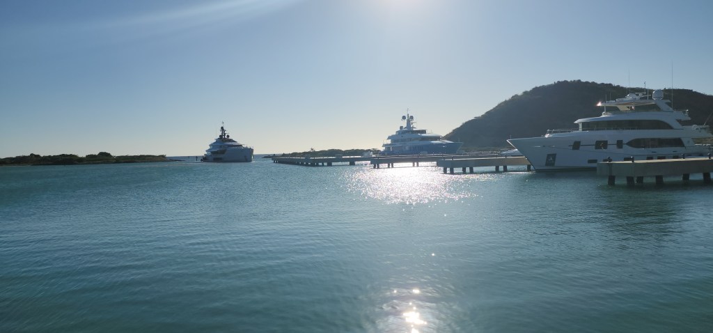 On our way home, our driver took us to Timothy Hill Overlook. It was really amazing views of the water looking out to the Atlantic on one side and the Caribbean on the other. At all the little stops there were monkeys. Our driver said they are baby monkeys they take away from their moms. It makes me wonder what happens to them when they get big. We didn’t support any of the guys with them. We came back to the boat and cleaned and I took a nap hoping to get rid of my cold. Cale picked up the rental car around 3, and we went on a drive around the island to explore. We went to Shipwreck Bay. It’s a real touristy bar right on the beach. It’s all wood and looks really cool. We right away saw monkeys. They put out food for them and they come down. They were really cute. We also saw some mongooses, which they introduced to the island to get rid of snakes in the sugar canes but they killed all the snakes. We drove to the South end of the island where the ferries go back and forth to Nevis, then to Christophine Harbor which is a fancy marina for big yachts that went bankrupt and was never finished. It was still very nice and had several super yachts at it. We watched one of them dock.