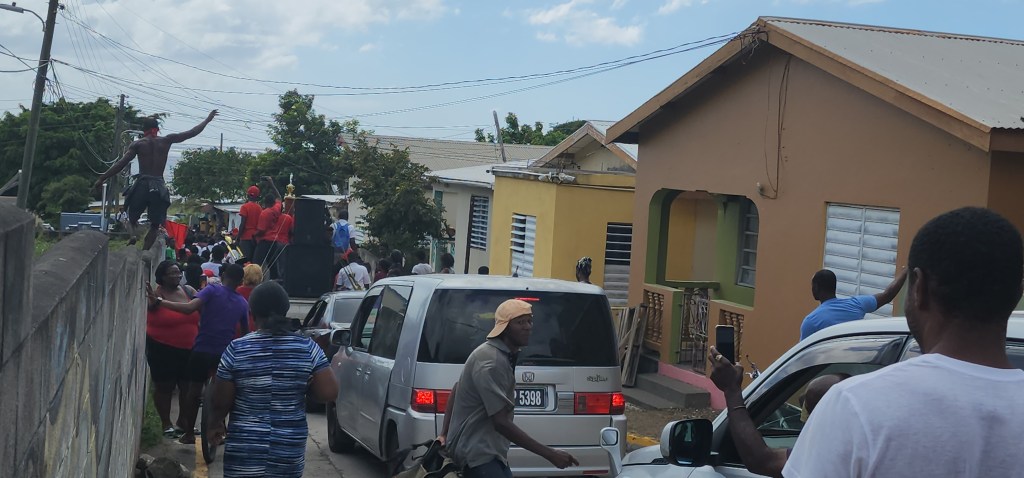 We next kept driving towards Black Rocks and encountered a party going down the middle of the road. We were stuck behind it so we all got out of the car, except Cale, and ran up to look. It was a celebration for their sports team winning the Caribbean region all sport, which we think means track. They were dancing and throwing things and climbing on walls. It was pretty crazy.