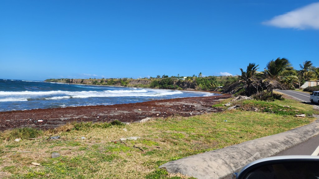 We tried a dirt road to go to the beach in the Atlantic side but our rental car wasn’t making it. After a bit of trouble we got the car turned around. We finally found an access point on the other side of the Marriott. There was a ton of sargassum on the beach.