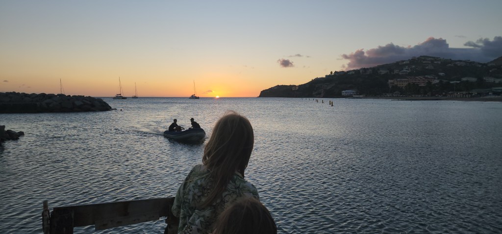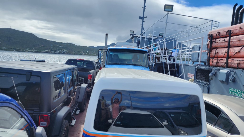 Cale rushed back as soon as we got to the dinghy and got our papers and then took the car on his mission. He was able to check out of customs after tracking down the worker who at 6:45 was out in the parking lot tinting his friends car windows. Port authority was closed so he had to go to the airport and beg the guy to do it there. They finally relented and he said he had a good laugh with the workers there because one of their co-workers apparently likes to sing loud but doesn’t have a great voice and was belting out a song. He just had the rental car situation left, which as mentioned, took a while but he succeeded. St. Martin here we come. The beach restaurants here have loud music all night which has made it hard for me to sleep!!