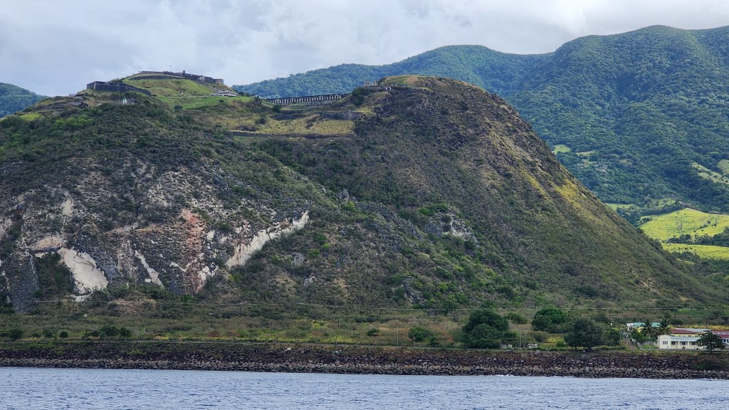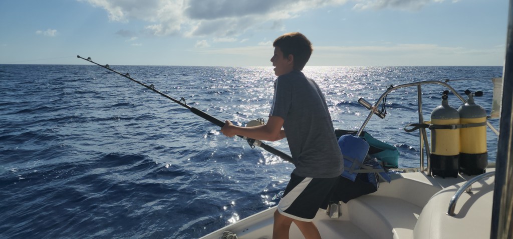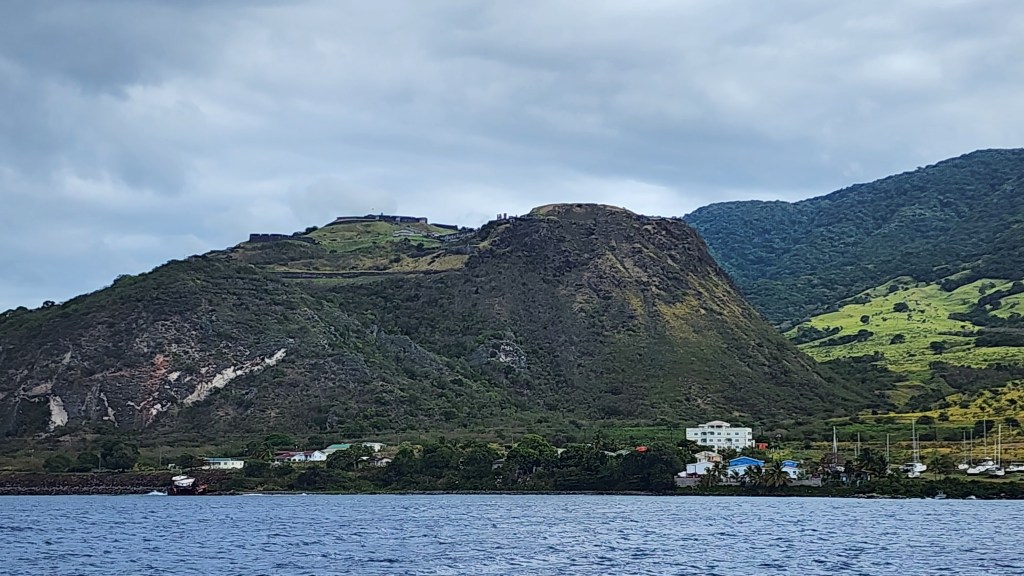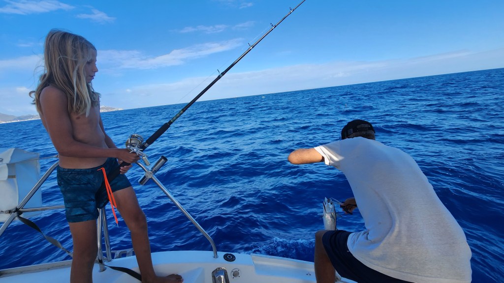 3-29 It was a day at sea. We headed out around 8 for our 6-9 hour journey depending on weather. We were able to start sailing towards the top of St. Kitts. It’s a beautiful coast line. It was especially cool to see Brimstone Fort from the water. We had been sailing for about 20 minutes and a big squall came with huge wind and sent us zipping. It was very sudden and we were going very fast. Cale quickly turned into the wind to de-power the sails but for about 30 seconds it was pretty crazy. After that, the winds settled and were pretty good. The waves were bigger then the 4 or 5 ft predicated for a while. Cale thought it was because it was only about 150 feet deep and St. Eustachious and Saba were on one side and St Kitts on the other. I think he was right because once we were clear of the islands it seemed to settle back into the 4 or 5 ft waves. We sailed as long as possible and then motored the last hour or so, so we could get there in time to check into customs. While we motored the boys fished. Cole first caught a decent size barracuda. They are scary looking with their big teeth. They both put their lines out again and both caught bonitas within seconds of each other. Cole’s was small and came off easily. Cade’s was bigger and hard to get off.