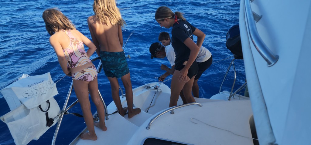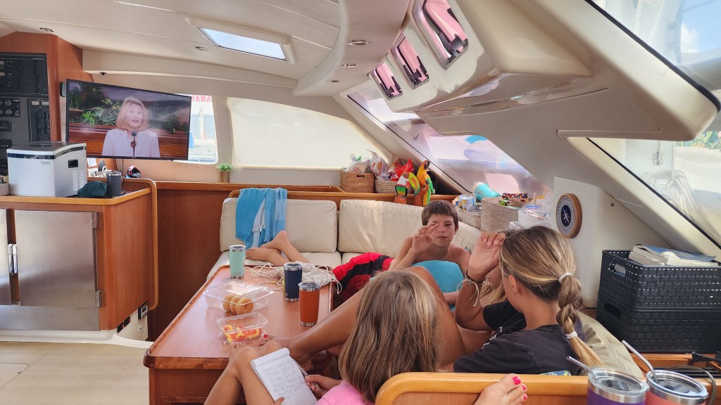 Then, Kira and I went shopping and the boys went to the beach and skim and boogie boarded. Kira and I had a good time. We were able to provision for guests. We got the groceries loaded and I sat down in the car and 1 rain drop fell in the window. About 5 seconds later, it just started to downpour. Kira and I laughed at how awesome the timing was. We got back and as we were unloading Natalie called and the kids told us Huxson broke his arm. I was shocked, but then we got back to the boat and told Kelsey and the first thing she said is “I bet it’s April fools.” So, we came up with a prank that our engines were down. Finally, Cale took it to another level and asked Natalie when we needed to tell Libby that we couldn’t make it and if she had travel insurance. She said she’d call mom and ask and we got off the phone. We called right back to say April fools but she didn’t pick up. Thankfully, we got a hold of her and after giving them a scare they heard the truth. Sadly, Huxson really did brake his arm. I feel bad for the little guy.