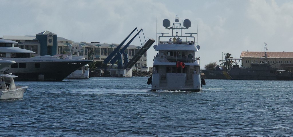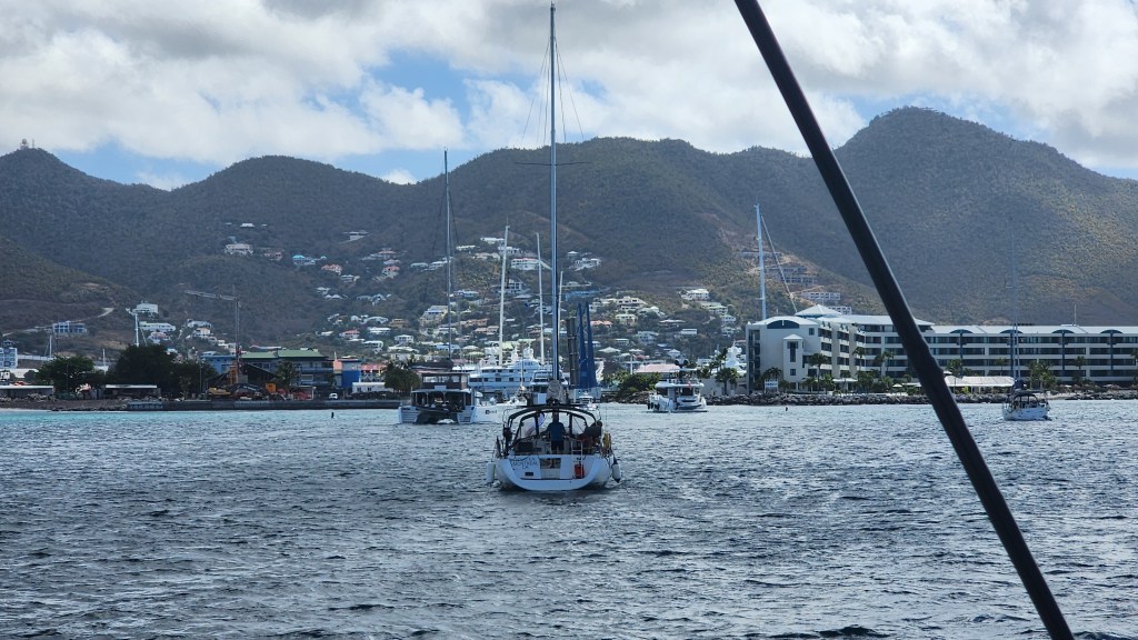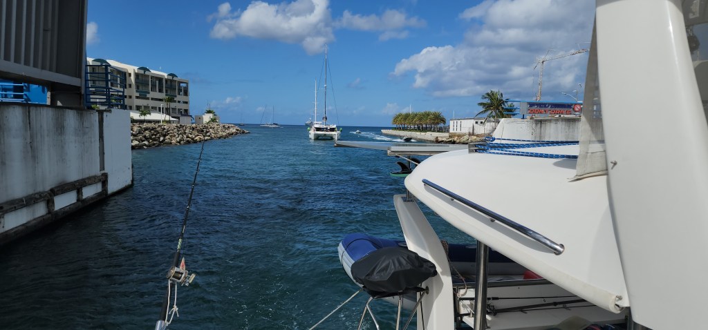 4-2 We decided to leave Simpson Bay at the 4:00 toll opening. That gave us a lot of the day to get ready, listen to conference and hang out. Before that could happen though I had to return the rental car and we both had to pull out cash so we’d have enough to pay our boat cleaner. The first ATM didn’t work so I ran to a different one. It was a close call, but once I got gas I had about 10 min to spare to get the car back. Cale dinghied over and picked me up.