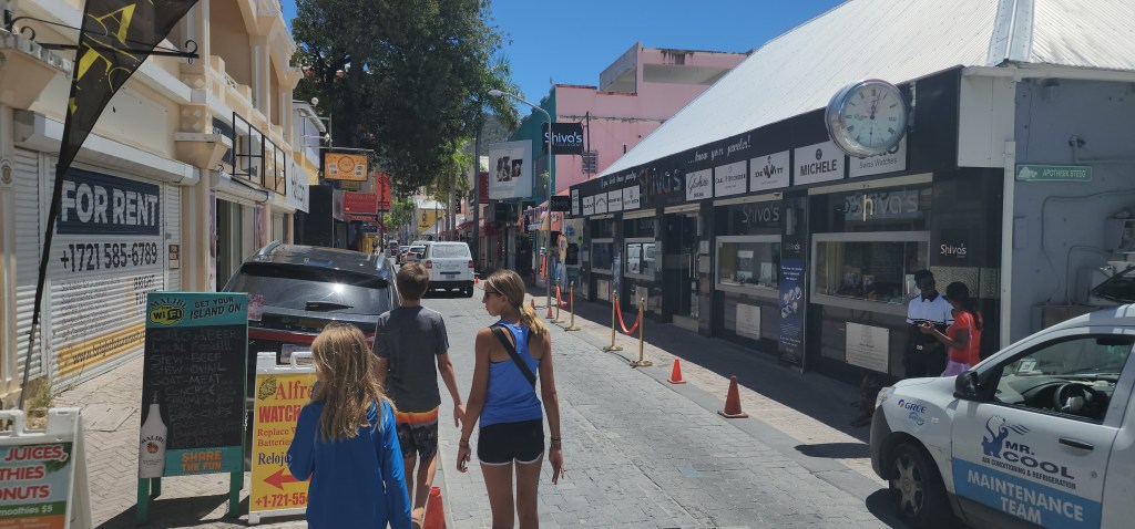 The kids and I left around 11. We went to the downtown shopping area of Phillipsburg. There was a cute little market shopping district, some souvenir shops, lots of jewelry shops and then some high end stores. We walked along those and also along the beach for a while. We stopped in a shop looking for sewing thread and more floss for our bracelets. We ended up getting some rugs and a few other small things. Prices are either in dollars or Galleons. The cost of things seem pretty good. I would say comparable to US.