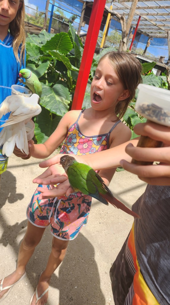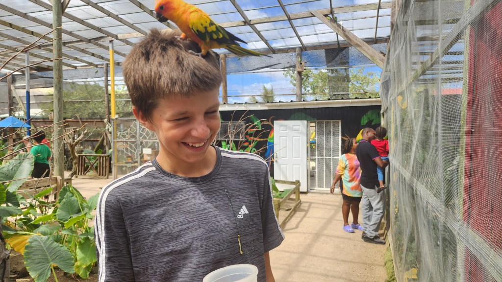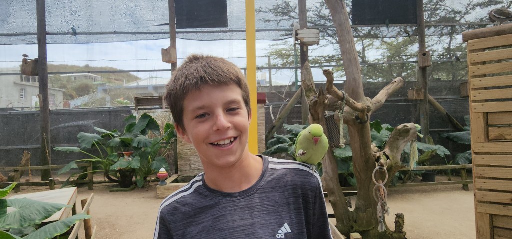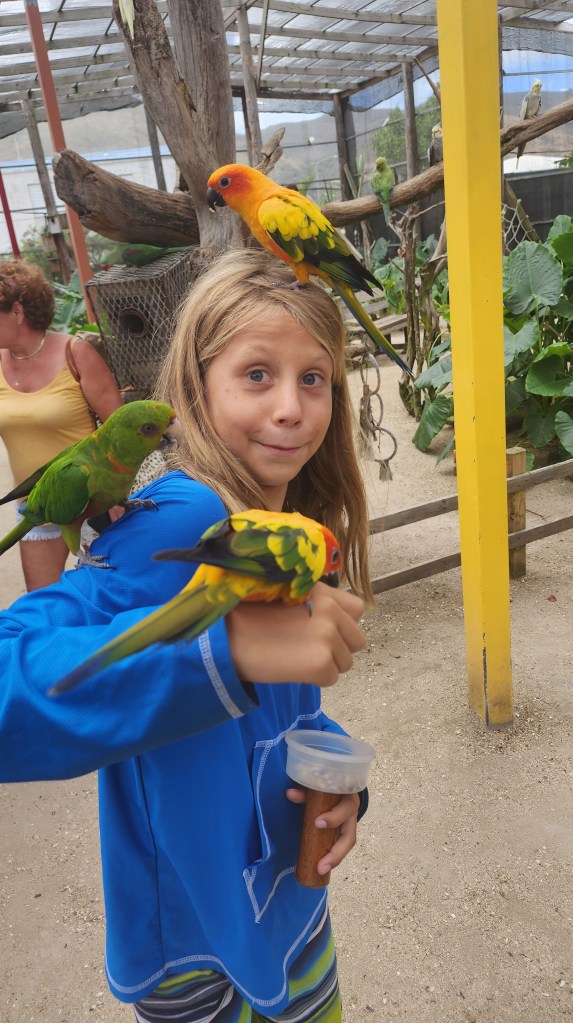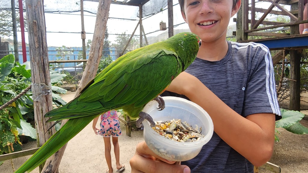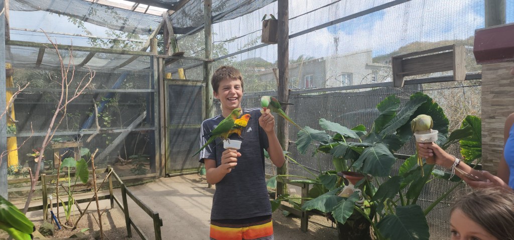 We next drove to the Parrotville Bird Park. I didn’t have enough cash so we had to go back to town for an ATM. On our way back, we drove across the border to France and back. The bird thing was so much fun. They come right over and eat out of the food cups they give you. We had so much fun. We loved a little bird names Peanut who was so friendly. There was also a talking parrot who said ‘hello’ for a peanut or a little food. The birds would just fly over sometimes and land on your cup, sometimes on your head. Every once in a while they would all just start flying around. It was a lot of fun. Cole got pooped on his shirt. I got it on my flip flop and foot. The birds really loved when Cole and Cade held apples. They swarmed all over.