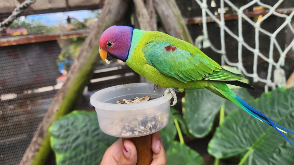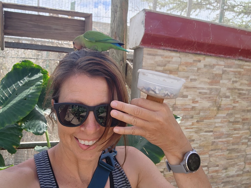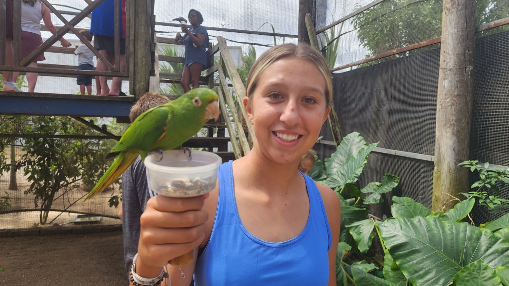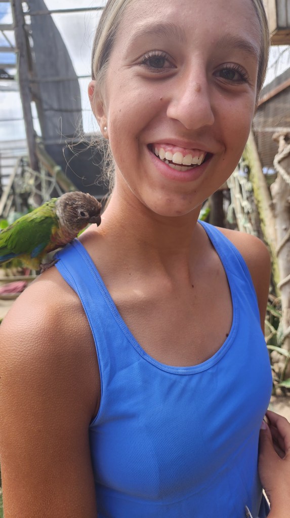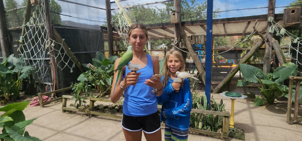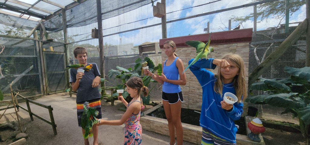 We next drove to the Parrotville Bird Park. I didn’t have enough cash so we had to go back to town for an ATM. On our way back, we drove across the border to France and back. The bird thing was so much fun. They come right over and eat out of the food cups they give you. We had so much fun. We loved a little bird names Peanut who was so friendly. There was also a talking parrot who said ‘hello’ for a peanut or a little food. The birds would just fly over sometimes and land on your cup, sometimes on your head. Every once in a while they would all just start flying around. It was a lot of fun. Cole got pooped on his shirt. I got it on my flip flop and foot. The birds really loved when Cole and Cade held apples. They swarmed all over.