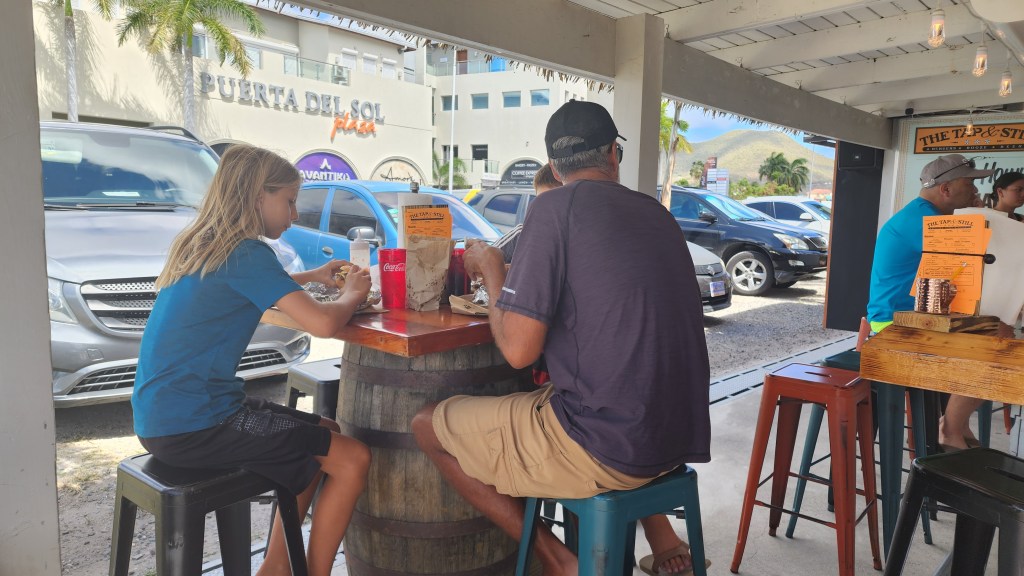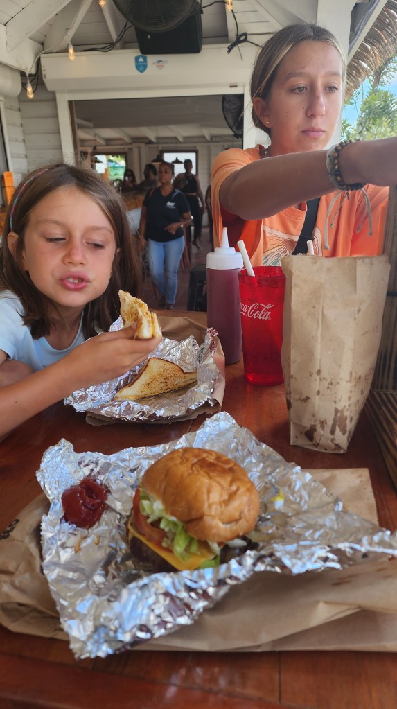 4-1 Kira, Kelsey and I had pedicure appointments at genesis with Maria. She moved her from the Dominican Republic and was married and had a son. She is now divorced but she stayed on the island for her son. She worked at the Hilton doing hair for guests for a long time and then after the Hurricane and COVID they stopped paying her so she went out on her own and rented a space. I wasn’t sure what to expect, but it turned out great. Maria did Kira’s toes first, then started my hair color. She painted Kelsey’s toes and finished my toes and hair. Kelsey and Kira got picked up by dad and the boys when they were done. We got lunch at Tap and Stills after. We first had it in the USVI right after we got the boat. It tasted so good. Cade, of course made up a name on his order. This time he was Bob. Kelsey was Koala.