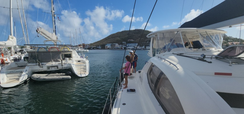 Cale took the dinghy to pay the fees so we could go through the draw bridge at 9:30 am. The kids did homework and we got the fenders and lines ready to dock. As soon as Cale got back we got in line. There were probably 10 or so boats. They don’t leave the bridge up for long so there was pressure to go through fast. Cale said he was a “titch nervous.” It went fine. We made it through safely. Then, came docking. On our way, we were getting super shallow depth readings, like .1. We were in the channel, so I we think it was just mud and debris that was registering. Docking went pretty smoothly.