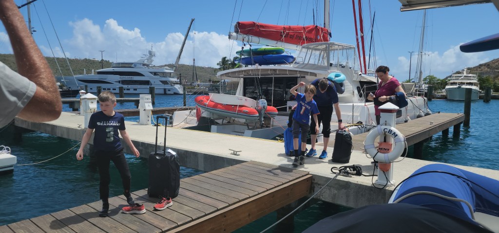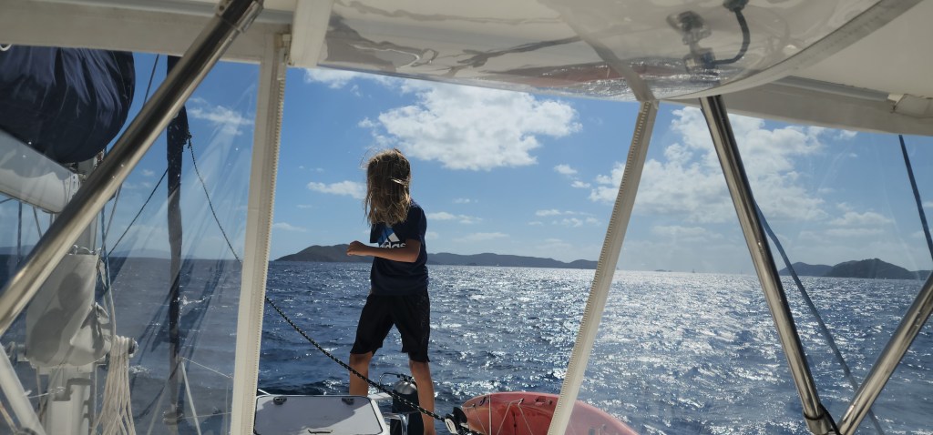 4-3. We left for USVI after going through the toll bridge at 4. We planned to arrive around 10-2. It was a long night. Cale put on a patch and it made him super tired so I did a long shift during the night. It was a almost a full moon and really cool how we were sailing right into it. We also were the farthest from land we’ve been, which was a feeling I thought I’d be afraid of, but it was actually really peaceful. We got to Charlotte Amalie around 12. So, 18 hours total. I was wiped. It was blowing 20 knots when we came into the marina at Crown Bay. We were trying to dock stern in with our starboard side tied, but and getting blown off the the dock. There was also a big pilon on the opposite side sticking out that we had to worry about. The first attempt we started blowing off and Cale aborted and went back out. The 2nd time the same thing started to happen. We were able to throw our stern line to the dock hand and he got a wrap on it, but there was no one to take our bow so we started blowing over. Cale went forward on port to try and spring us in but the wind was so strong it didn’t work and our front port hit the pilon. Thankfully, it mostly hit the kayak and Kira was there with a fender so there was no damage. A guy from another boat came to grab the forward lines. It helped but it still took awhile to work ourselves to the dock. Cale and I walked over and checked into the marina. We came back and got the kids and took a cab to check in. It’s the 1st time all the kids had to be there. We got dropped off at Ace to get stuff to work on the other toilet which is now clogged. Our cab driver was really nice from Jordan but it cost 75 dollars. I was in shock. It was like a 5 minute drive. It looks like we will be walking from here on out. We came back and cleaned the boat. I helped Cale get up the mast to clean some rust. It was pretty windy so he didn’t last too long.