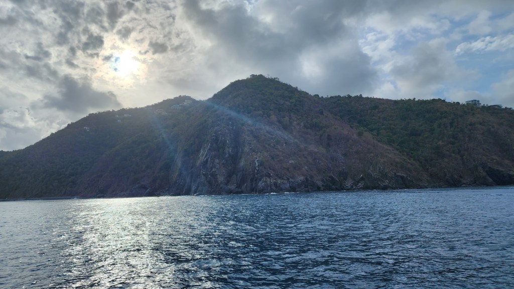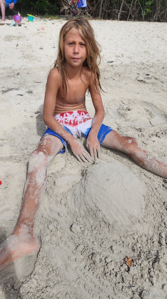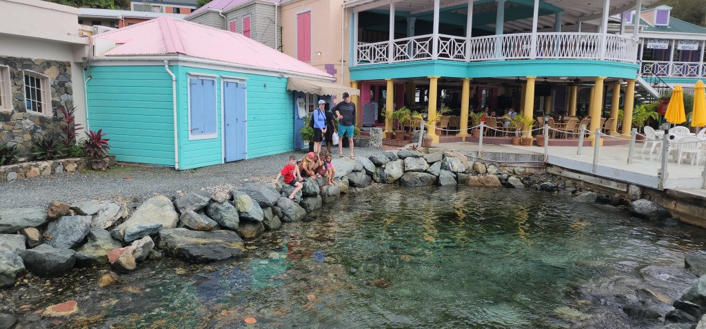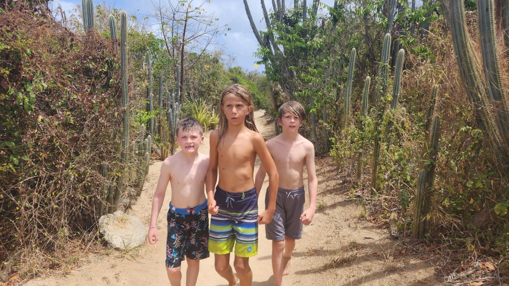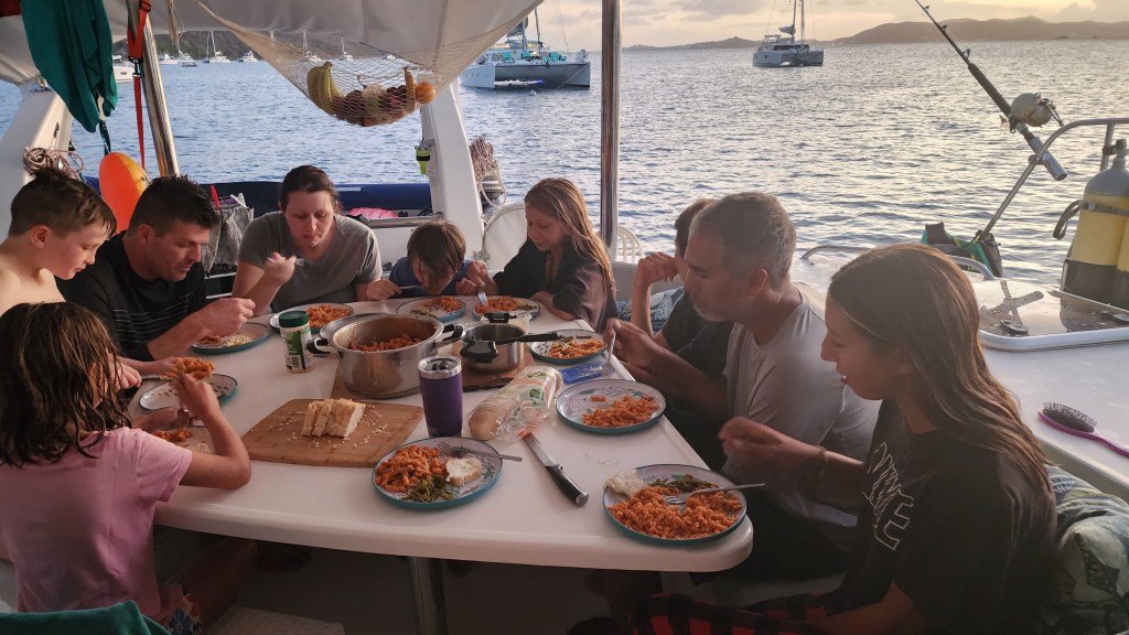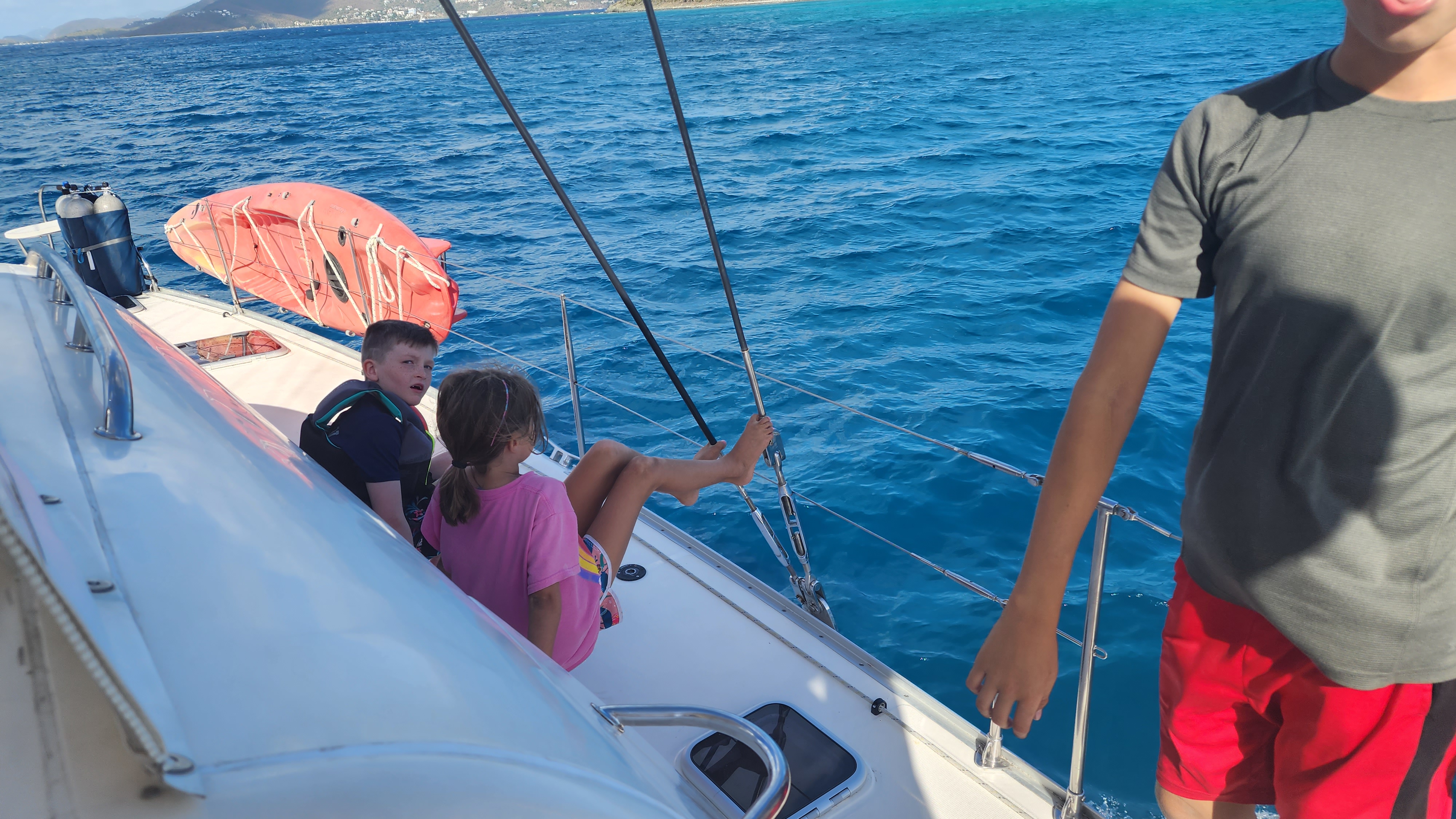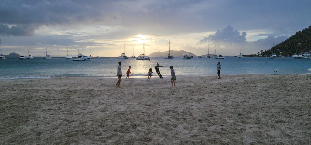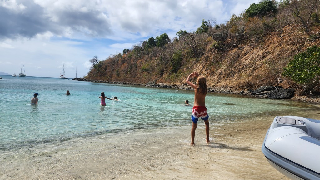 It was a little rough once we got out of the bay. We were beating right into the waves. The kids had fun jumping on the deck with waves. Cole in particular was getting some very big air. Sadly Marcus got sick. I’m sure being tired didn’t help. We tried to moor at Christmas Cove but it was full so we went on the Honeymoon/Caneel Bay on St. Johns. We got a mooring ball and the kids jumped in and swam. They all went to shore while Cale worked on de-clogging the poo and I made dinner. After an unsuccessful attempt from the top Cale decided to go in the water and try. I never thought I’d hear him say I hope I come back covered in poo. Sadly, no Poo. It’s still blocked.