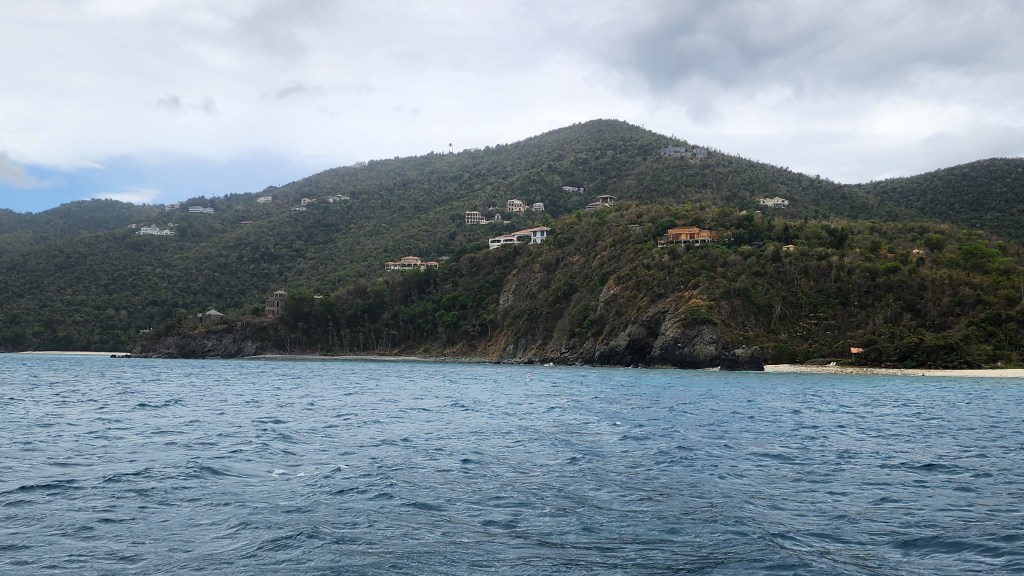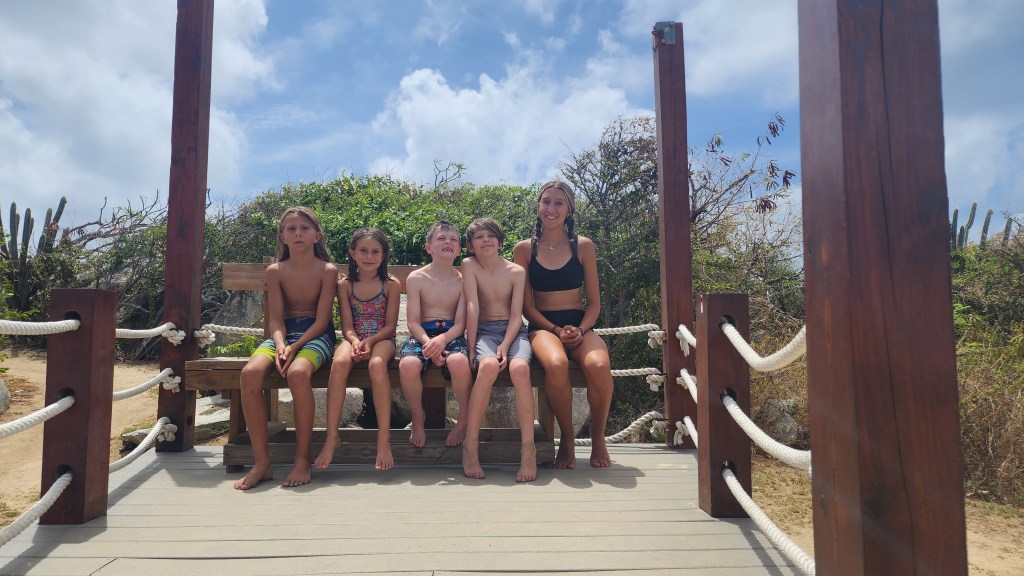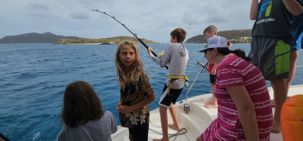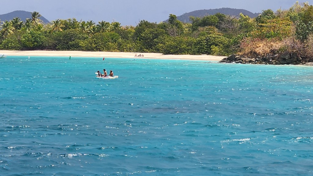 4-5 Our night at Honeymoon/Caneel Bay wasn’t terrible but a bit rollie. It seems like it’s mostly from big boats coming by outside the bay. Cale and Marcus went to Cruz Bay to make sure it was okay if we didn’t check out from the USVI. While they were gone we had breakfast. A very informative and friendly park ranger came by and told us about paying and the rules of the park. It feels weird to be back in the US. Cole, Cade and Broxson wanted to go to the beach. I was hesitant because it looked like a storm was coming. They took the paddle board anyways and made it just fine. About 30 minutes later, a huge thunderstorm crack came out of know where. I glanced over to where the boys were and could see them scrambling to put their life jackets on and jumping on the paddle board. They paddled their fastest back. The storm passed quickly. We got a bunch more rain a little later. We left around 10. We thought about staying at Truck Bay to do the underwater path, but it was pretty windy so we came to Maho instead. We grabbed a ball between Frances and Maho Bay. The kids went to the small beach in the dinghy that is closest to the boat. Cale and I snorkeled over. On our way, we saw a huge turtle. The kids played at the beach for a while and then we went over to Maho. We saw the biggest turtle I’ve ever seen with 2 big remoras on it. We followed it around for quite a while. We also saw a ray and I saw a big round looking fish. Still not sure what it was. Cale, Libby and Marcus walked the beach to check on getting a taxi to town. It was 12 per person so we opted for dinner on the boat. We got back and the kids did more swimming. We discovered yet another new toilet issue. This time it was Kira’s toilet. It was leaking water out of the bottom. It was salt water and Cale figured out the pump needed replaced. Thankfully, as is often the case CAVU provided and we had a spare one on board. Now, if we could just clear out the lines on our side!
