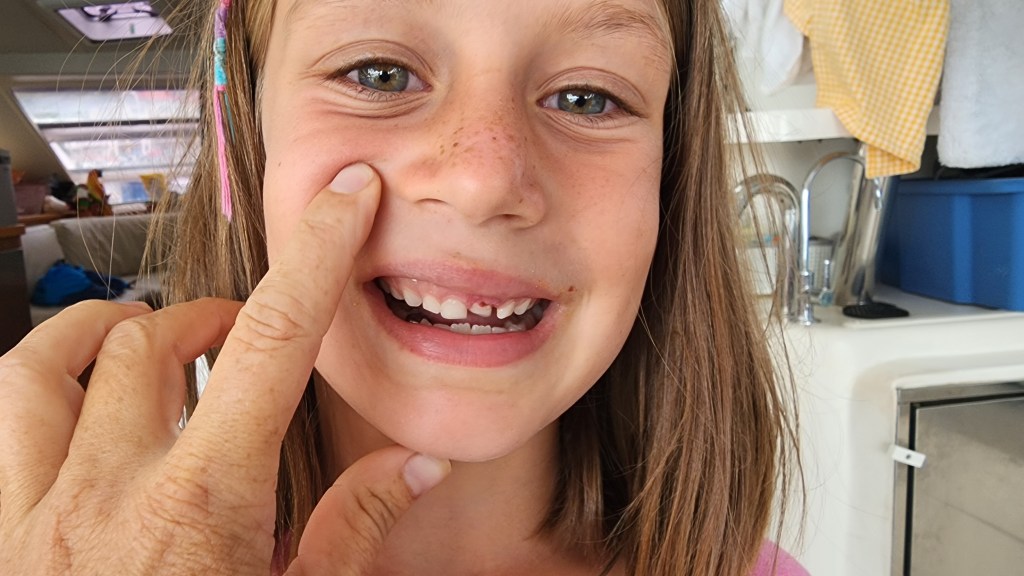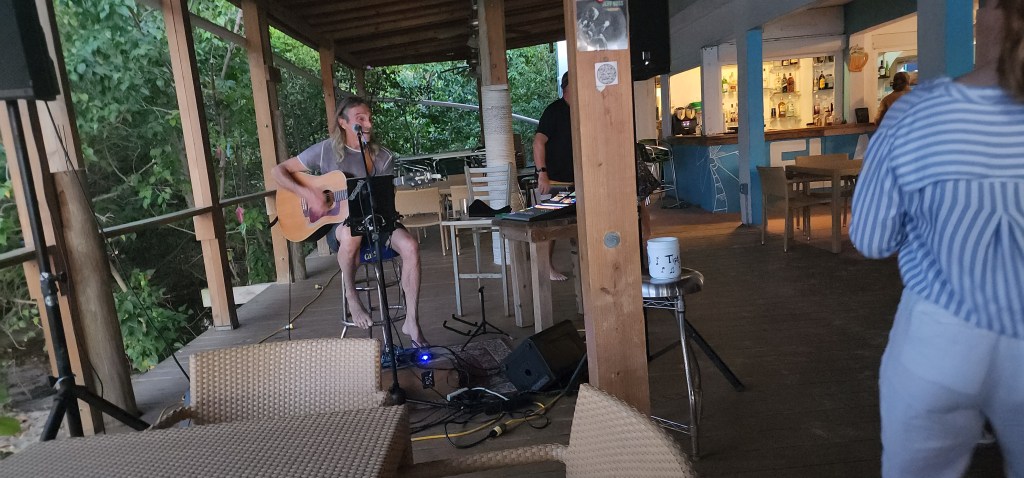 3-6 We didn’t stick to our original plan of getting up early and checking in at Spanish town. We decided to go to Sopers Hole instead and just as we were going to leave it started to pour down rain. We waited it out. We had lightening and thunder. It rained heavy, but in the bay next to us it was coming down even harder. Once it settled, we left for Sopers, which was 30 minutes. It was known for being a pirate hangout. We lucked out and got a mooring ball. Cale went in to check us in. While we waited, the wind blew Kelsey’s hat into the water, so we put the paddle board in and I went and got it. It stayed pretty drizzly and wet. We all went to town to check it out. It was cute, but small. There was a nice grocery store, pretty expensive. We left and headed east towards Road Town. It was really rough beating right into the waves and also the storm so we changed plans after about 20 minutes and decided to back track and go to the northwest side of the island. It was much calmer once we turned around and got on the north side. We ended up getting a mooring Cane Garden Bay. We got a great spot right in front of Elm Beach. We went to the beach. Kelsey’s front tooth has been loose for over a week. She bumped it just before we went to the beach. When we got to there she decided she had enough and she was ready to let me help her. I promised her if she told me to stop I would. As soon as she gave me the okay I just hurried and with one quick pull it was out. It didn’t even bleed. She was so happy to have it out. Her whole smile looks so different now. This is the 4th tooth we’ve lost on the boat so far. Cole-2 and Cade-1. It was close enough to paddle board back and forth to the boat. Kelsey felt very big to be able to paddle it. The weather cleared up and it was a beautiful beach day. Most of us went back while Cade and Broxson finished building a turtle out of sand. I went back to pick them up on the paddle board but they wouldn’t come until we got a picture so Libby went back and picked them up. On my way, a sting ray jumped out of the water in front of me and then I could see it in the water. Our mooring ended up belonging to Elm Beach restaurant. The owner came out to collect $40. We decided to eat dinner out. A guy named Jeff Ross was playing. It was loud, but he was so good. At first it was just us. Soon, it was a big group of 30 ish people for a ladies birthday. It got a little wild just before we left.