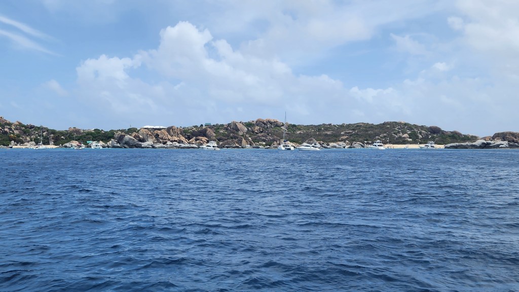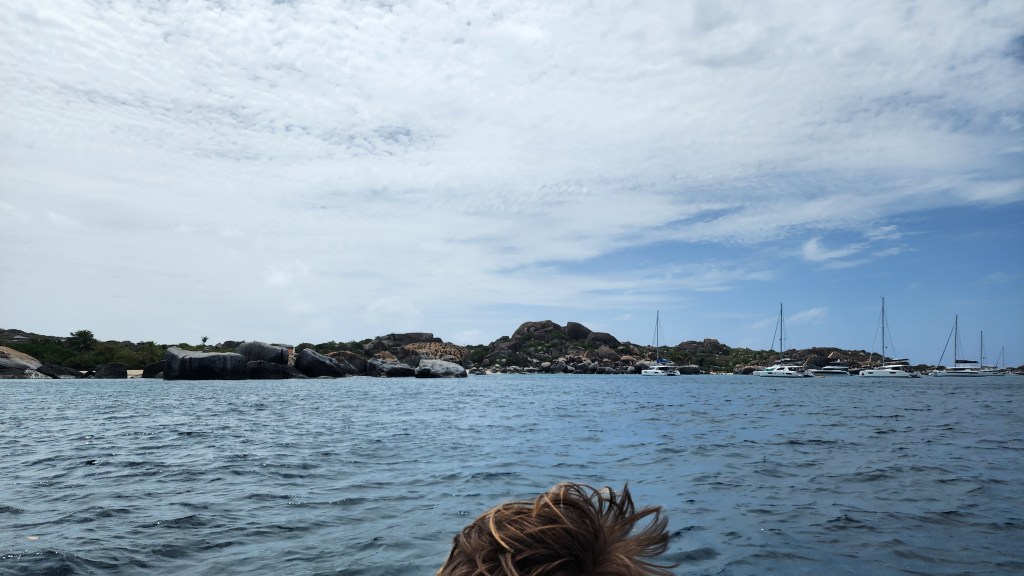We swam back to the dingy and headed to Old Jerusalem Island, Fallen Jerusalem National Park. We moored and did some snorkeling. Libby and her boys took turns paddle boarding. The visibility was awesome. The rocks and formations under the water were very unique. I loved how they dropped off down to a sandy bottom. There were not a lot of fish, but some. Next we were off to hopefully anchor/moor at Cooper Island, but we couldn’t find a good spot. We tried Salt Island but there just wasn’t a lot of room. Our next spot we tried was Peter Island, Great Harbor. There were a lot of moorings available. We had hoped to anchor, but it was too deep. The kids swam and jumped off the boat and swam the lazy river. It’s quite windy here but the water is pretty calm. There was a big barge tied off in the bay. We saw the boat Mike and Muffy work on. They just finished their charters and another couple is on it now. Cale met them when he was here buying the boat so we tried calling them on the radio but didn’t get through.