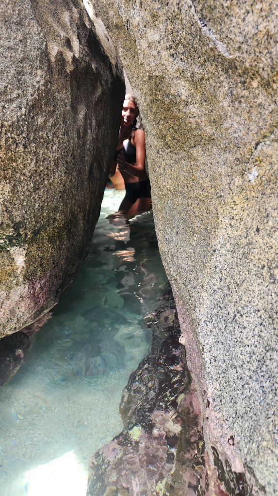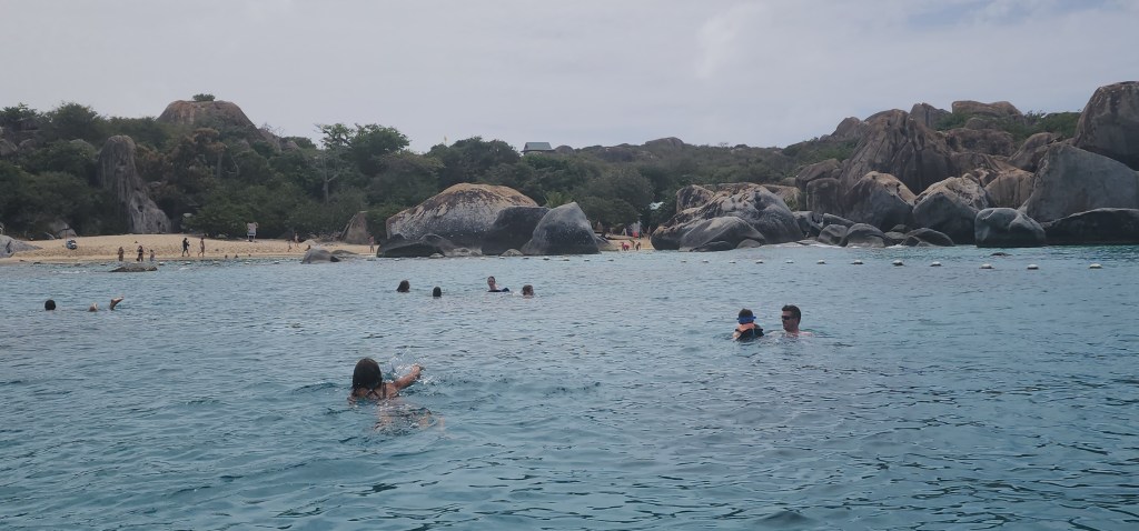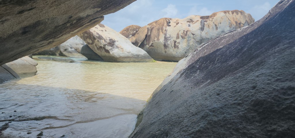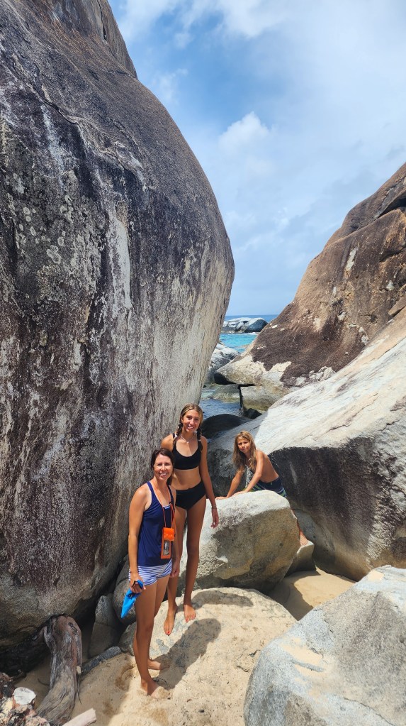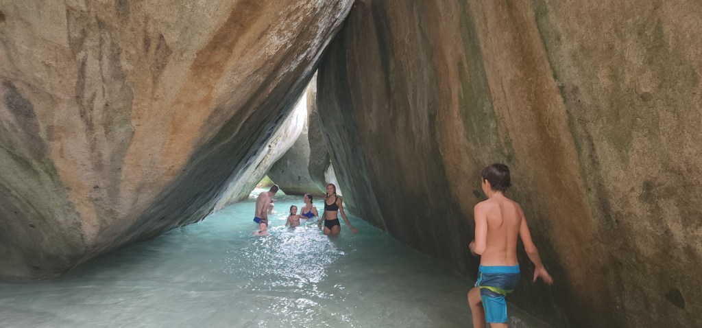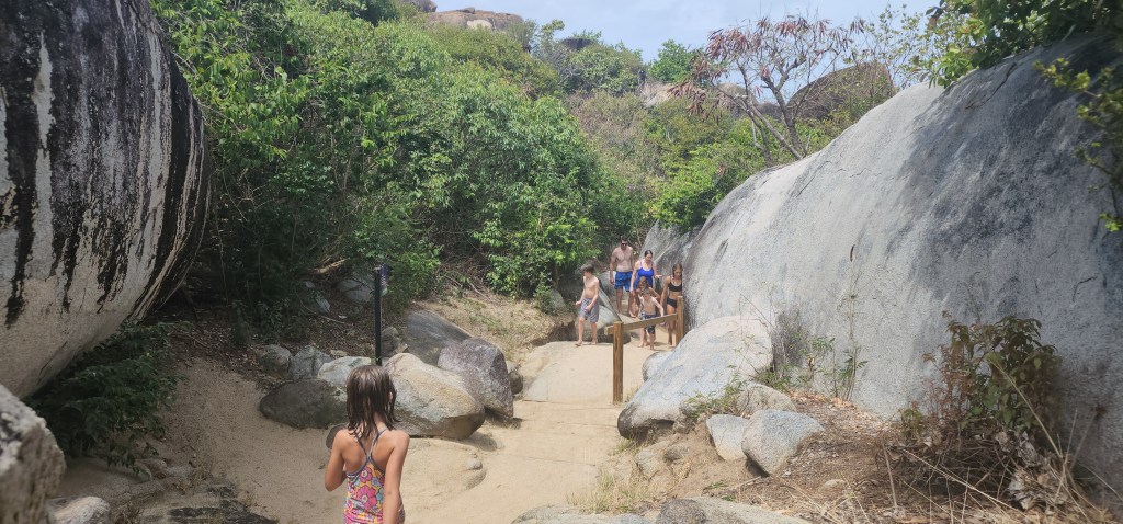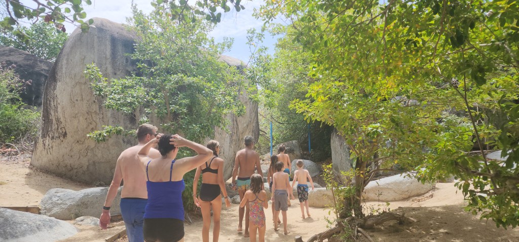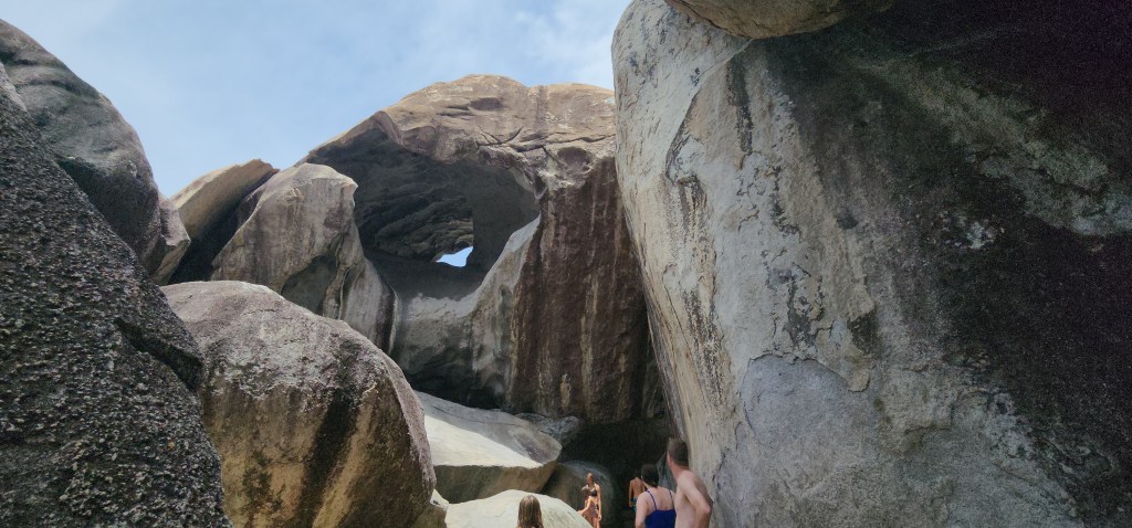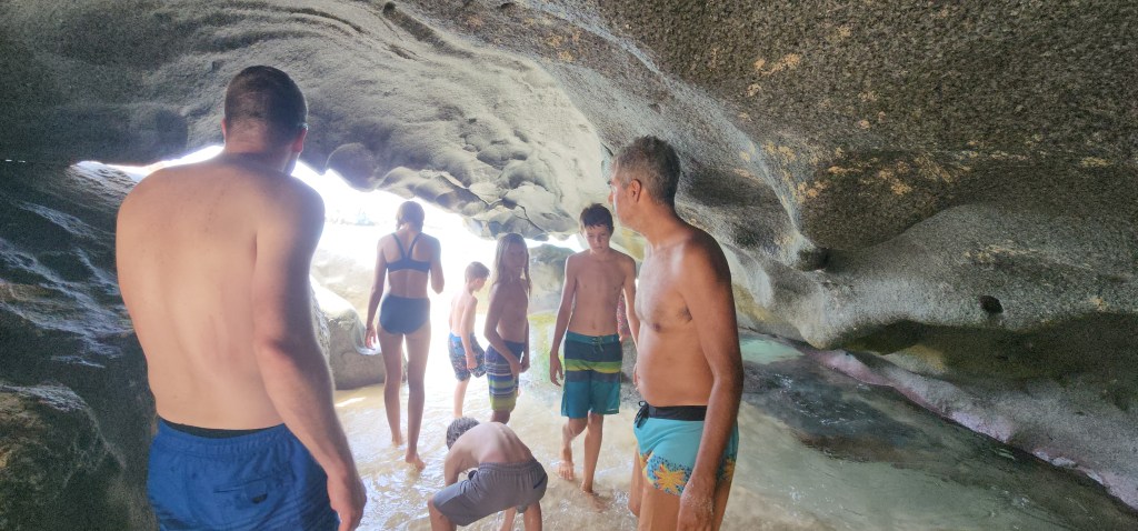 4-7 We didn’t get as early as a start as we hoped but we were on our way at 7:30 ish to Virgin Gorda to see The Baths. We had heard it can get very crowded. We were able to find a mooring ball. We took the dinghy and tied up to the dinghy line and then swam to shore. We brought shoes but ended up leaving them on the beach. We discovered we had to do a short hike to the start and them come out the other side where our stuff and dinghy were because its one way. The hike was nice. We saw so many lizards. It was sandy with some steps. We passed by the ranger station where we had to pay. The baths were very cool. Huge boulders and pools of water, some more hidden then others. We were so excited that we basically had it to ourselves when we were in the caves. We must have timed it just right. They were really worth seeing. Beautiful huge boulders that formed overhangs with beautiful water in them.