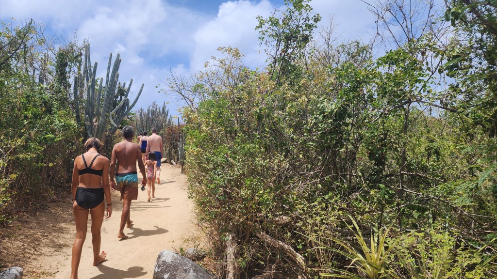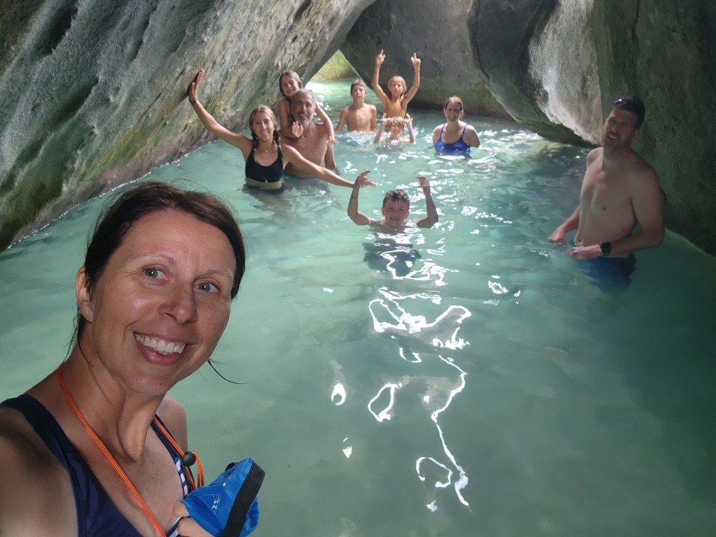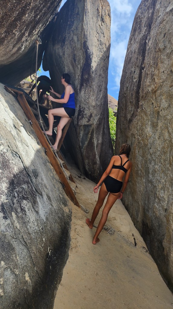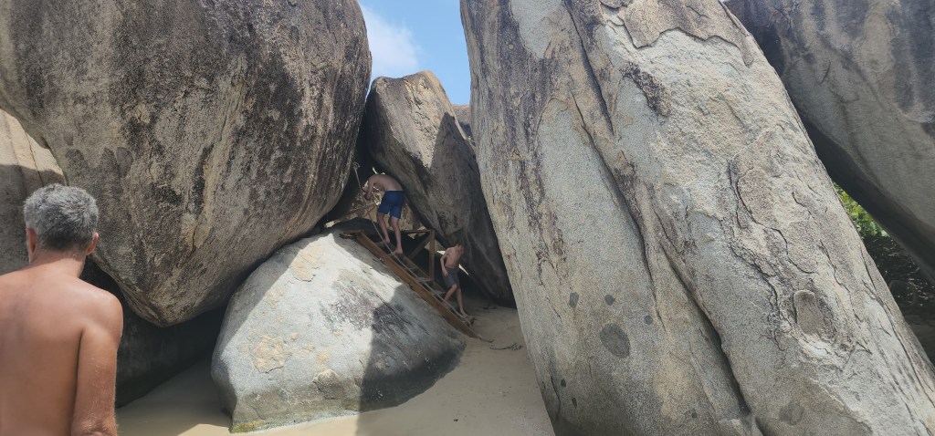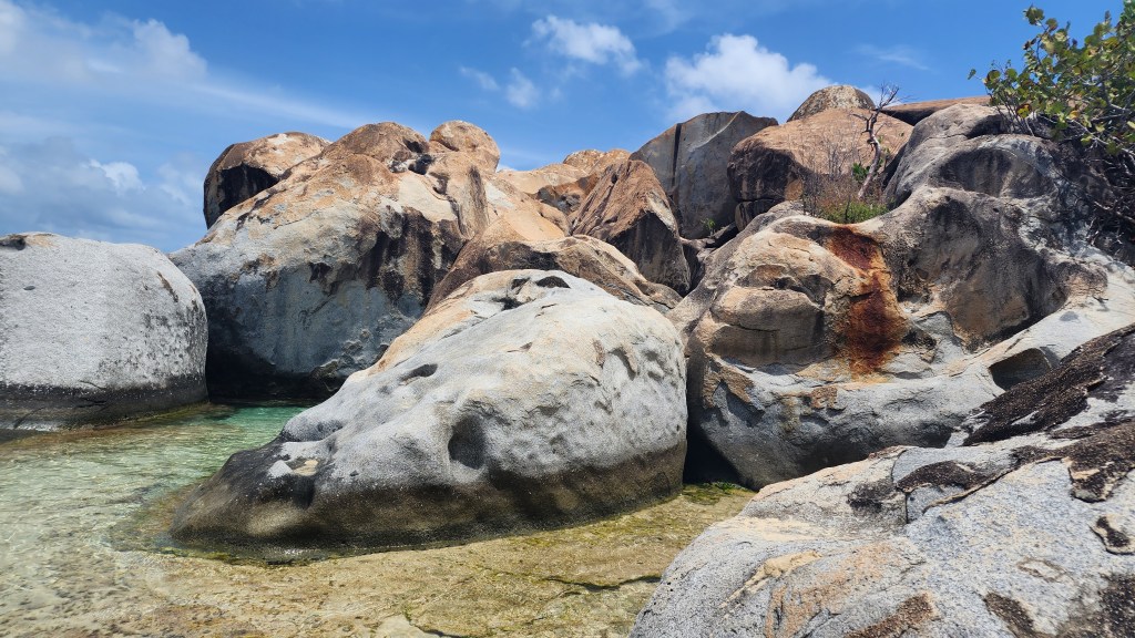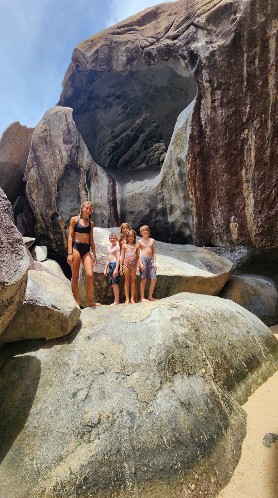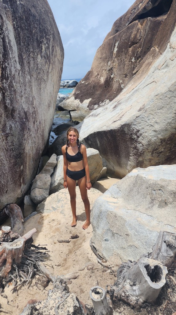 4-7 We didn’t get as early as a start as we hoped but we were on our way at 7:30 ish to Virgin Gorda to see The Baths. We had heard it can get very crowded. We were able to find a mooring ball. We took the dinghy and tied up to the dinghy line and then swam to shore. We brought shoes but ended up leaving them on the beach. We discovered we had to do a short hike to the start and them come out the other side where our stuff and dinghy were because its one way. The hike was nice. We saw so many lizards. It was sandy with some steps. We passed by the ranger station where we had to pay. The baths were very cool. Huge boulders and pools of water, some more hidden then others. We were so excited that we basically had it to ourselves when we were in the caves. We must have timed it just right. They were really worth seeing. Beautiful huge boulders that formed overhangs with beautiful water in them.