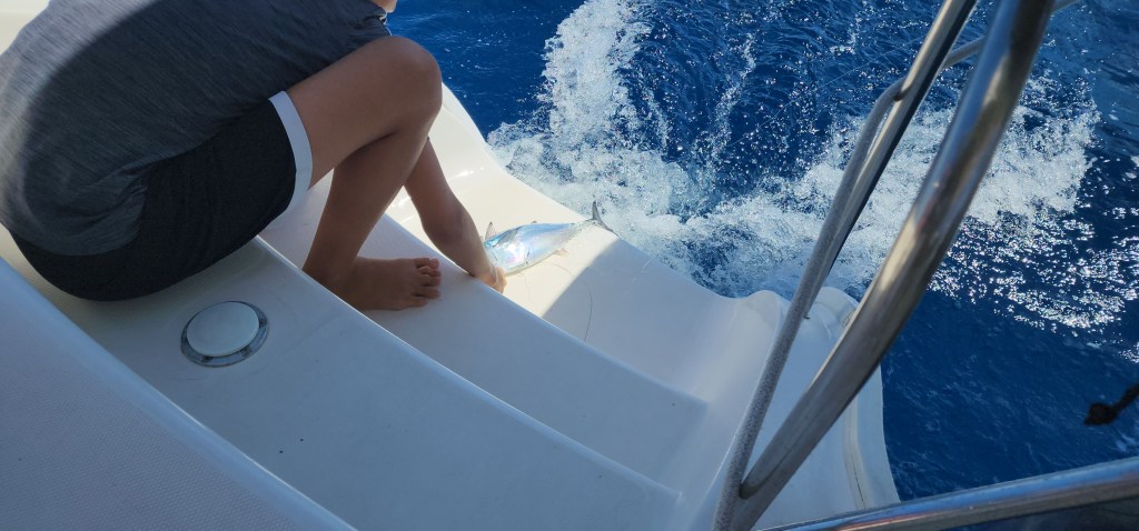 4-15 We moved from USVI to Vieques. We got going about 9am. It was a pretty uneventful passage. Mostly downwind, but started swirling and had to motor last hour or so. Cade caught a fish. He thought it might have been sea weed because it wasn’t really fighting but once we got it in saw that it was a small fish. I think a bonita. It took us about 6 hours. We anchored out in the bay in the city of Esperanza. The kids and I went to shore because Cale didn’t want to leave the boat until we made sure the anchor was secure. Cole was driving and got distracted by what he said were sharks but was actually tarpon chasing after the boat. He took us close to some rocks so I jumped in a little sooner then I’d hoped and got pretty wet. We walked around and got some names of cabs drivers for a ride to church tomorrow. It’s weird how just like that it feels like Mexico. There is a cute little walkway along the water. There are quite a few tourists around. There are only 2 other boats anchored out by us. We got back to the boat and the kids were anxious to wing foil. We had 2 wings and 2 boards and took turns. I went first and did okay. I almost turned but fell at the last second. The kids are getting good. It will be nice when we can go up wind. Without the foil you can only go down and so we had to use the dinghy to shuttle. We got back to the boat and a metal can of kidney beans had burst open all over the canned foods. Kira and Kelsey were helpful getting it cleaned up. The boys worked on putting the wings and boards away. The generator wasn’t spitting water but was running fine.