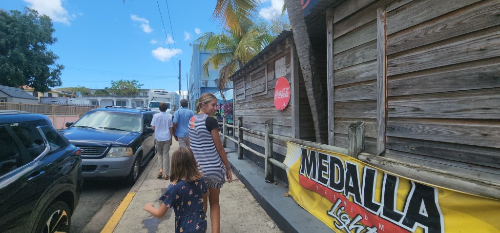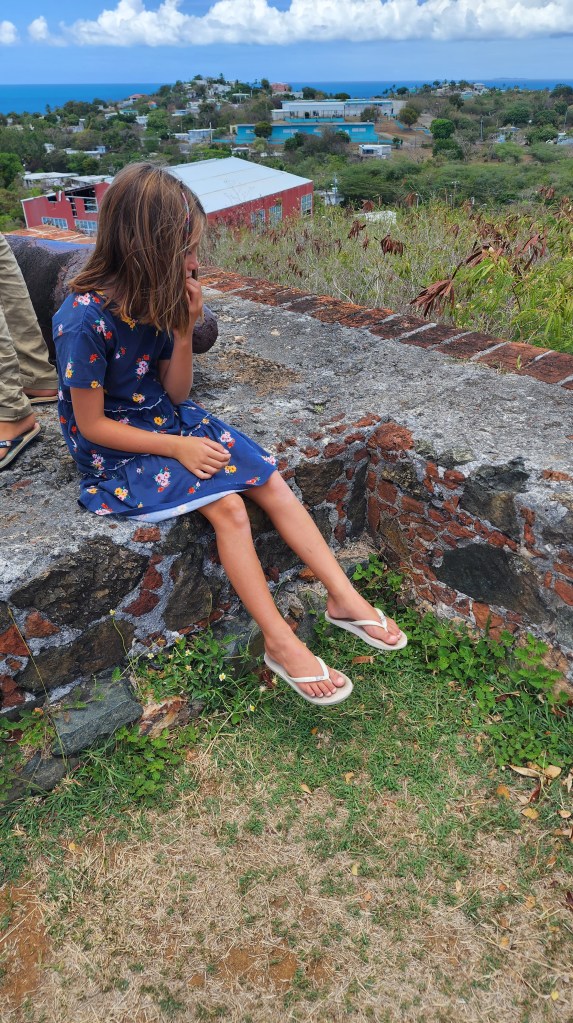 My favorite part of being on a new island is always walking around. You get to see the island in a more intimate way. They kids bare it but I don’t think they love it. It was especially hot and the kids were not feeling it today, especially Kelsey, but we walked around anyways. We walked down to the water and up to the light house, which wasn’t accessible. Next, we walked downtown to the main square and then up to the museum and fort. The man said we could look around the outside of the fort but not the inside. We still aren’t sure exactly why because it all looked open. We have heard there is an anti-American/outsider sentiment here so our best guess was that. On the way, we passed lots of horses. We also had 2 dogs come out barking and growling at us. It was kind of scary. One time Cale was in front of Cole with Cade. A dog was going at Cole. It was a pretty but it little dog but vicious. I’m screaming at if from about 30 feet behind while Cole is kicking at it. Cale didn’t realize what was going on. It snapped at Cole several times, just grazing the skin on his ankle. I then had to walk by with the girls. I grabbed a stick and as soon as I did they dog ran away. Sad, but must have been hit before. I was just glad it didn’t keep attacking. Also, so glad it didn’t break skin where it got Cole on his ankle. We went back to the square and met our cab driver. The niece of the owner came and got us. She was a fun lady. She is a fisherwomen for her job and helps her aunt. She took us a different way back. We passed a man on the street and she said ” oh he’s so crazy.” She told us how he puts money in places and then watches to see if people will get it. Then just leaves it there.